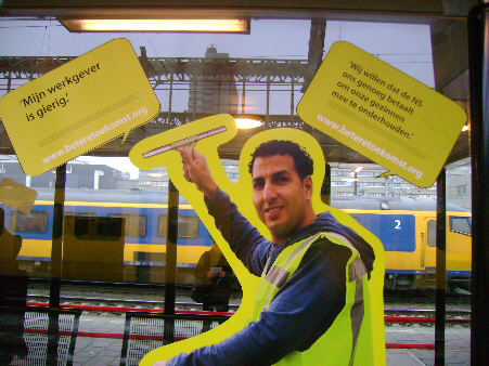 De NS voerde een pr-campagne om te laten zien hoe hard schoonmakers werken. De schoonmakers plakten er zelf stickers bij waarop stond dat ze dan ook wel goed betaald willen worden (foto: Eric Krebbers)
