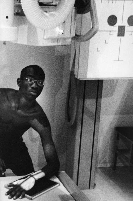 Vluchteling onder handen genomen door een röntgenapparaat.