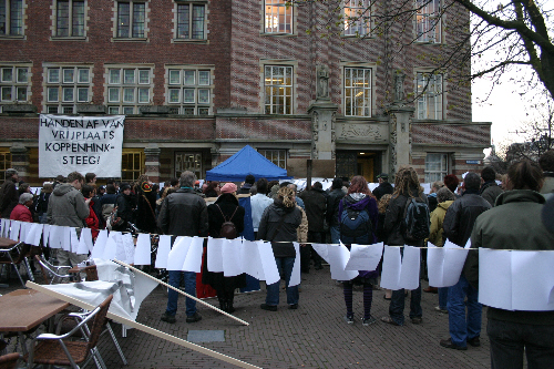 Manifestatie van Vrijplaats Koppenhinksteeg op 1 april 2008 bij het Leidse stadhuis.