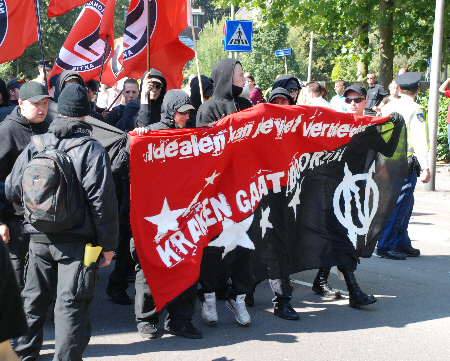NSA-ers op een NVU-demonstratie in Oss. Op hun spandoek staat de tekst “Idealen kan je niet verbieden, kraken gaat door!”.