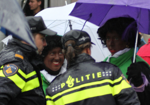 Nu.nl geeft in haar berichtgeving van gisteren een vertekend beeld van de gebeurtenissen van vorig jaar. Men schrijft: “Tegenstanders van Zwarte Piet ontrolden een spandoek uit met de tekst ‘Zwarte Piet is racisme’. Voorstanders gingen voor het spandoek staan, waarna een opstootje ontstond.” Dat is zeer incompleet en daardoor misleidend. Toen het spandoek eindelijk tevoorschijn gehaald werd, had de politie al tientallen van ons gearresteerd en richting klaarstaande bussen gebracht. De aanhoudingen begonnen ruimschoots voordat er van ‘opstootje’ of zelfs maar van demonstratieve actie in alle ernst sprake was. Velen van ons, ik ook, werden met min of meer zachte hand weggevoerd, maar agenten werkten bekend anti-Zwarte Piet-activist Kno’Ledge Cesare ruw gewelddadig tegen de grond. Arrestanten kwamen later op de dag vrij, het gezag deed het voorkomen dat iedereen een boete zou krijgen van 220 euro.