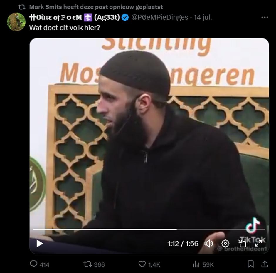 In deze post doelt “dit volk” op moslims. In het filmpje geeft deze man een conservatieve preek, waarin hij een oordeel velt over wat vrouwen wel of niet zouden moeten dragen. Ik vind zelf dat hij daar weinig zeggenschap over heeft, maar dat heeft niets te maken met dat hij moslim is. Christelijke en seculiere mannen hebben ook met enige regelmaat de misvatting dat ze wat te zeggen hebben over wat vrouwen dragen. Als je dan vraagt “wat doet dat volk hier”, dan generaliseer je een hele groep mensen op racistische wijze.