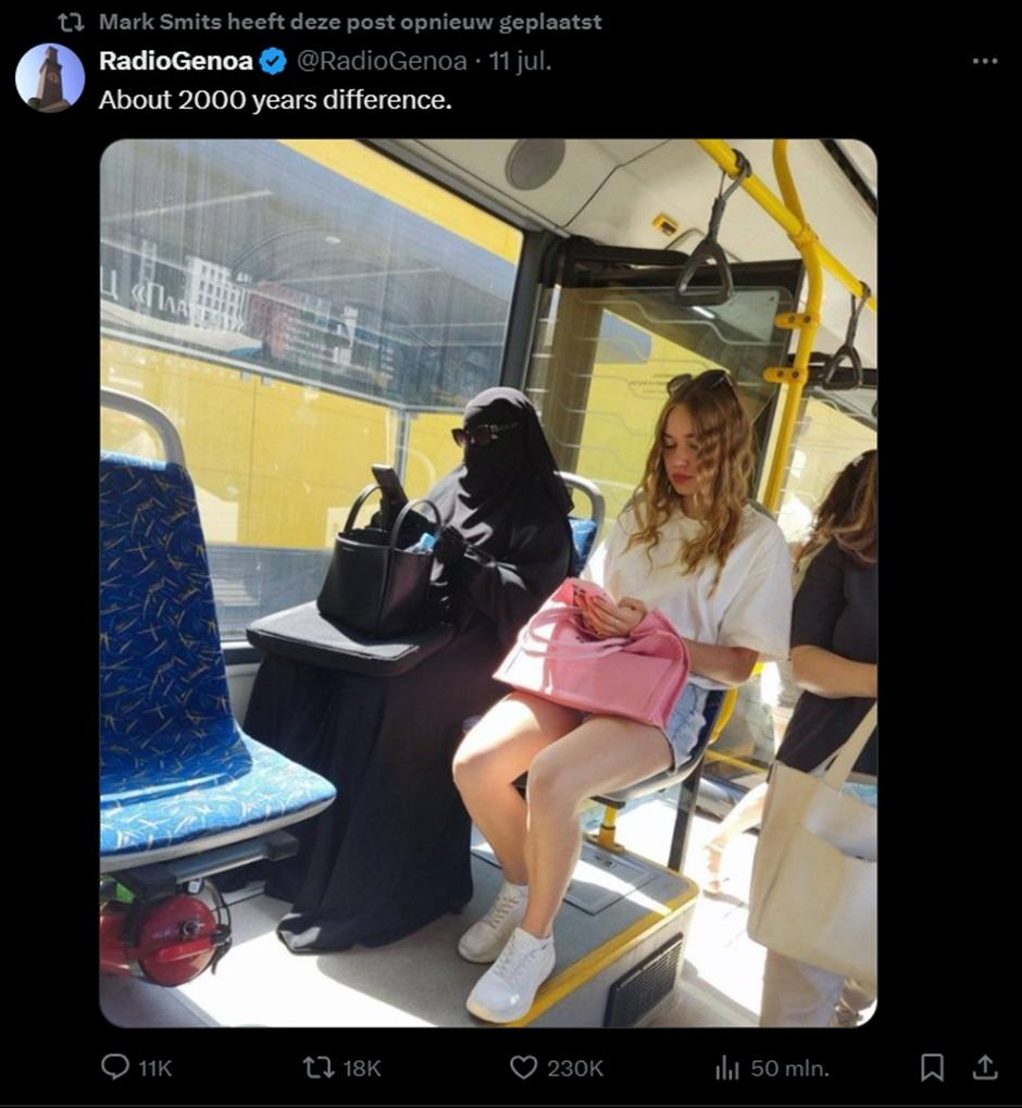 Over patriarchale witte mannen gesproken: een ander opmerkelijk iets is hoe Smits zich blijkbaar eigenaar voelt van vrouwen in de publieke ruimte. Deze foto met racistisch en discriminatoir bijschrift is kennelijk gemaakt zonder medeweten van de mensen die erop staan, iets dat je sowieso nooit moet doen. Degene die hem oorspronkelijk gepost heeft, lijkt een afkeer te hebben van de vrouw links en de vrouw rechts juist goed te keuren, simpelweg omdat zij meer huid laat zien (en natuurlijk omdat ze wit is). Beide vrouwen hebben het recht om zich te kleden zoals ze willen, maar daar is Smits het dus niet mee eens.