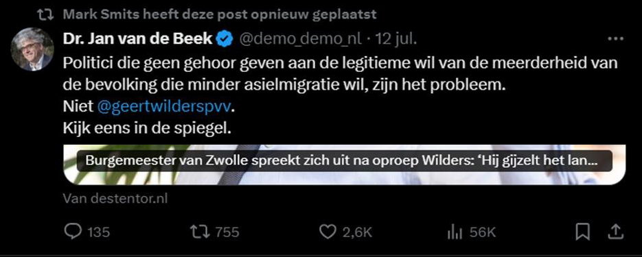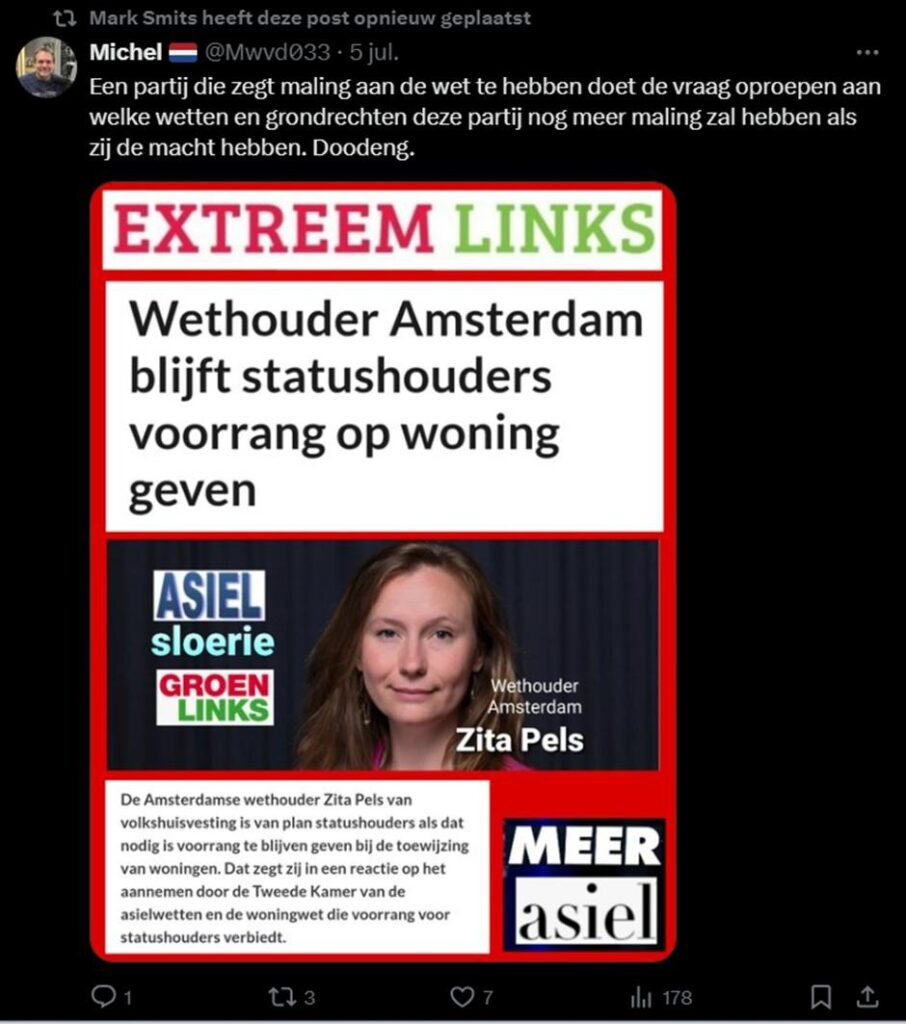 Dat Mark Smits een misogyne zak is, blijkt ook wel uit dit bericht dat hij heeft gedeeld. Hier wordt de Amsterdamse wethouder Zita Pels een “asielsloerie” genoemd, een extreem seksistische belediging, puur en alleen omdat ze statushouders wil blijven huisvesten.