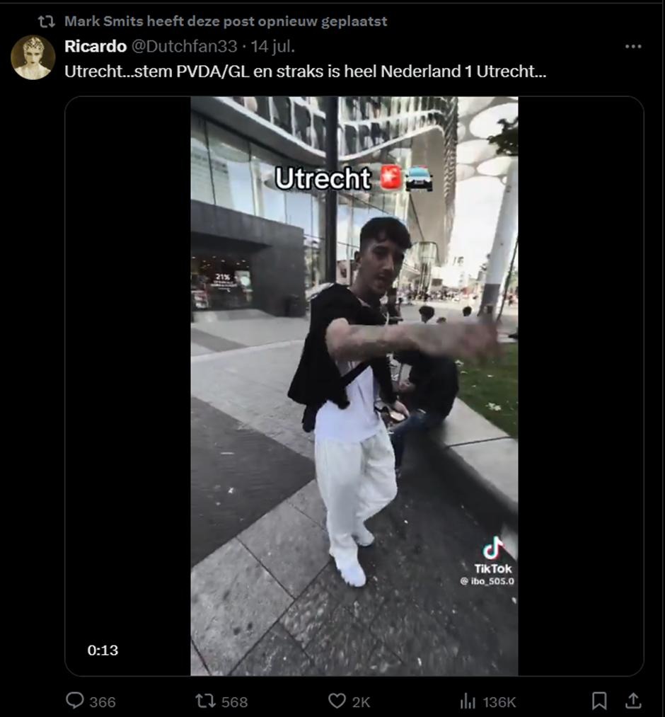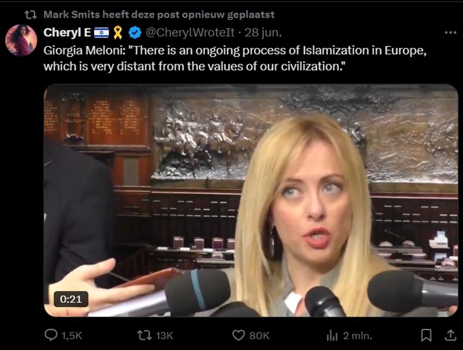 Dat Mark Smits in “omvolking” gelooft, is niet alleen impliciet, maar ook expliciet. Zo deelde hij deze video waarin Giorgia Meloni, op haar beurt de fascistische premier van Italië, waarschuwde voor de “islamisering” van Europa. Ook dit is een “omvolkingstheorie”, waarmee een racistische angst voor demografische verandering wordt aangepraat.