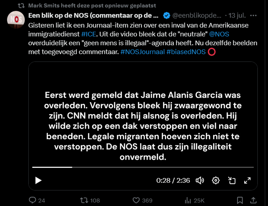 Dat Smits geen vriend is van vrije meningsuiting wisten we al, maar dat gaat verder dan alleen SLAPP-zaken. Smits deelt deze video van “Een blik op de NOS”, een extreem-rechts Twitterkanaal dat bekendstaat om het verspreiden van complottheorieën over de NOS. De kritieken van dat kanaal zijn compleet overtrokken, en er grotendeels op gebaseerd dat de NOS niet hun specifieke mening naar buiten brengt. Zoals in deze video: een ongedocumenteerde migrant was in de VS van het dak gevallen na door ICE opgejaagd te zijn. Het punt van het Twitterkanaal, dat dus door Smits wordt gedeeld: als die persoon niet ongedocumenteerd was geweest, dan had die niet hoeven weg te rennen voor ICE. Een gruwelijk omdraaien van schuld naar het slachtoffer.