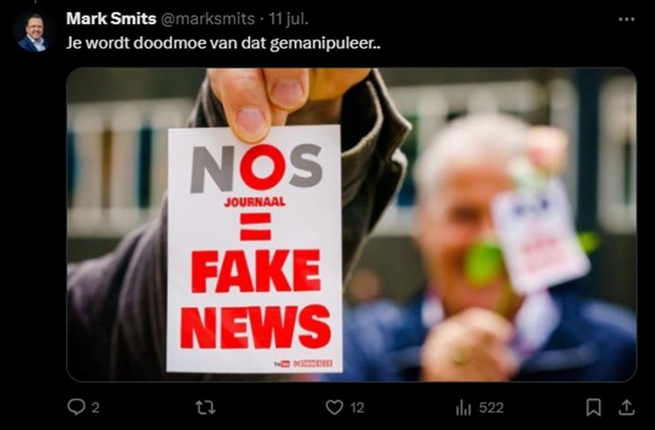 De NOS is een van de meest voorkomende onderwerpen op Smits’ Twitterfeed in de afgelopen twee maanden. Hij lijkt te geloven in alle complottheorieën die “Een blik op de NOS” verspreidt. Afgelopen 11 juli deelde hij nog een foto van een “NOS Journaal = FAKE NEWS”-sticker, gemaakt door complotdenker Tilasmi Frigge van het YouTube-kanaal “De Ommekeer” (zoals ook te zien is rechtsonder op de sticker).