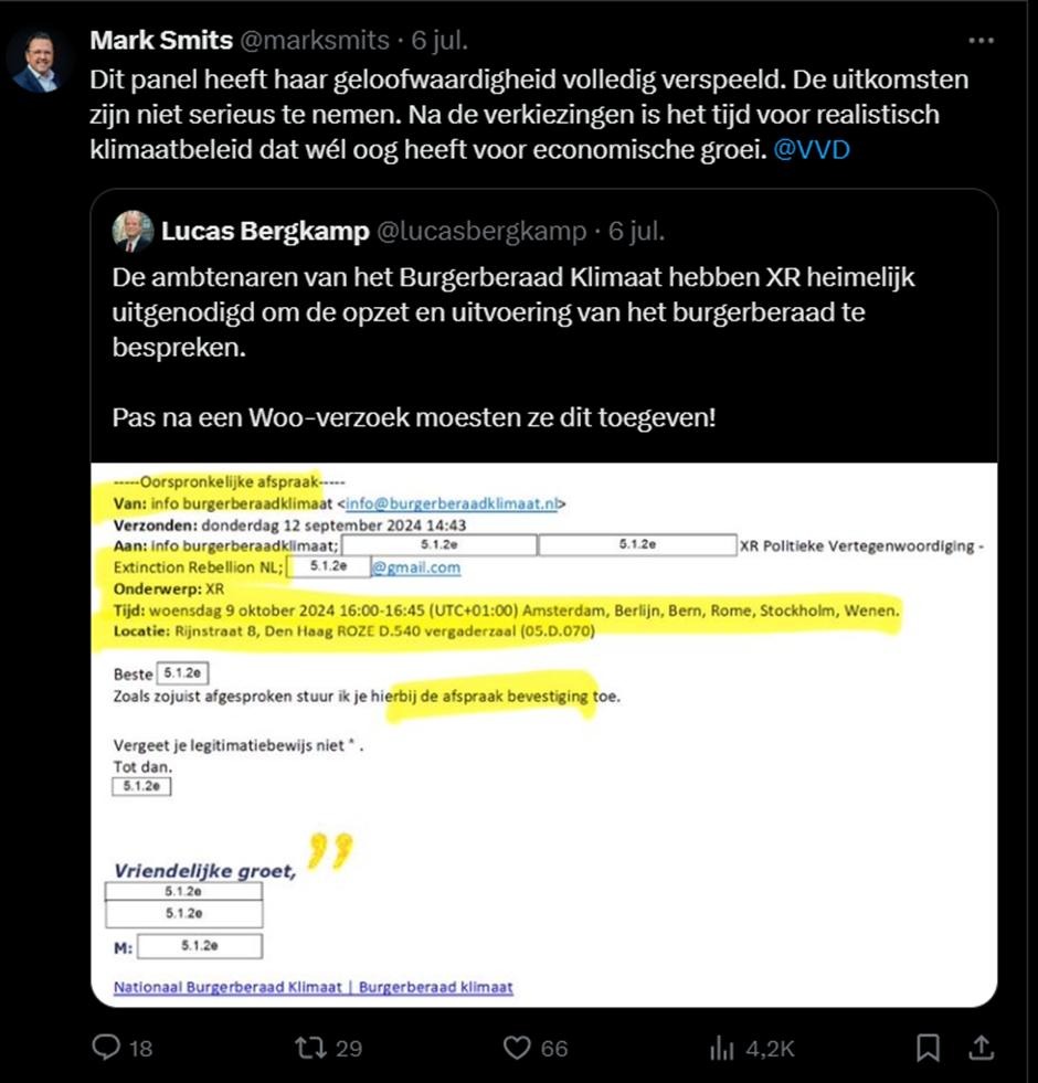 Daarnaast verspreidt Smits ook nog andere complottheorieën. Hier stelt hij dat het Burgerberaad Klimaat haar geloofwaardigheid “volledig” heeft “verspeeld”. Naast dat de VVD, van het ministerie van “Groene Groei”, zelf compleet ongeloofwaardig is, ligt het in twijfel trekken van het burgerberaad precies in het politieke straatje van Smits. Hij is immers toch al geen fan is van effectief klimaatbeleid. Hij zou de uitkomst nooit serieus hebben genomen. Vandaar ook dat hij zo hoog van de toren blaast over niets: blijkbaar hebben ambtenaren van het burgerberaad een gesprek gehad met Extinction Rebellion (XR). Wat Lucas Bergkamp impliceert, is dat XR daarmee de touwtjes in handen heeft, maar dat blijkt helemaal nergens uit. Ook dit is weer een complottheorie, met XR in de rol van manipulator achter de schermen.
