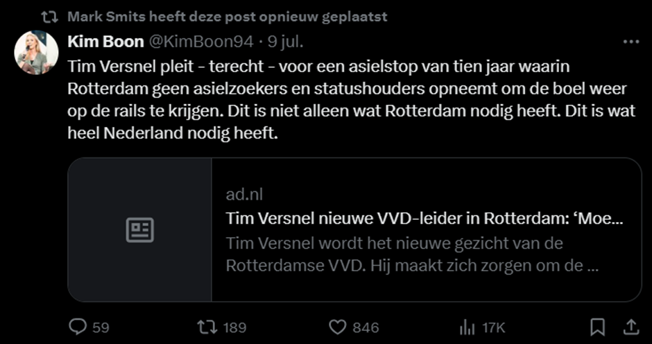 Er is feitelijk weinig onderscheid tussen de PVV van Wilders en de VVD van Smits, blijkt ook uit meerdere gedeelde tweets. Zo wil Smits, net als de VVD in het recente verkiezingsprogramma, een “asielstop”, wat in feite inhoudt dat mensen die voor hun lijf en leven moeten vluchten niet in Nederland terecht zouden kunnen. Die periode van tien jaar is niet alleen onmenselijk, het is daarnaast ook nog arbitrair. Dat arbitraire blijkt uit het feit dat de VVD geen tijdelijke maar een permanente asielstop wil, en na die tien jaar (een politieke eeuwigheid) is zo’n stop makkelijk te verlengen.