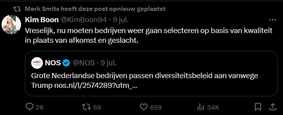 Niet alleen Wilders kan op steun van Smits rekenen. De VVD-er is ook een voorstander van het beleid van Donald Trump. Dit bericht deelde hij toen bleek dat Nederlandse bedrijven hun diversiteitsbeleid zouden aanpassen nadat Trump zijn heksenjacht tegen diversiteit begon. Het idee dat “diversiteit” het omgekeerde is van “kwaliteit” is natuurlijk ook weer een racistisch en misogyn punt. Het doel van diversiteitsbeleid is juist om er voor te zorgen dat geschikte vrouwen en mensen van kleur niet langer omwille van hun gender of huidskleur worden geweigerd.