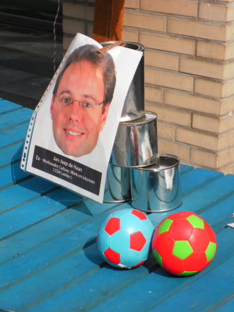 Tijdens het eerste deel van de manifestatie konden weer ballen gegooid worden naar een stapel blikken met daarop de tronies van gehate bobo’s naar keuze. Deze keer hadden we in de aanbieding: premier Mark Rutte, minister van Sociale Zaken Lodewijk Asscher, staatssecretaris van Sociale Zaken Jetta Klijnsma, wethouder van werkgelegenheid Jan-Jaap de Haan en de directeur van het Leidse dwangarbeidcentrum Bas van Drooge. Bij alle bobo’s werd nog wat pikante informatie verstrekt. De tronie die het meest bekogeld werd, zou uitgeroepen worden tot meest gehate bobo. Voor veel mensen was het een heerlijke uitlaatklep om de bobo’s neer te halen. Enkele toevallige voorbijgangers en bezoekers van Sociale Zaken deden spontaan en enthousiast mee. Een deelnemer had zelfs geen bal nodig en gaf een van de tronies simpelweg een hoek met zijn vuist. Dat was ook effectief. Uiteindelijk werden Van Drooge en Klijnsma beide het meest geraakt en moesten ze dus in de eer delen.
