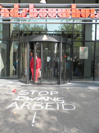 Een deelneemster had ook nog stoepkrijt meegebracht en bracht recht voor de ingang de tekst “Stop dwangarbeid!” aan. Nog geen tien minuten na ons vertrek was de straat echter alweer helemaal schoongeschrobt. Zo gaat het altijd na afloop van onze acties tegen dwangarbeid: zodra de laatste actievoerder zijn hielen heeft gelicht, komen ambtenaren naar buiten om heel nauwkeurig alle resterende sporen van ons protest (stoepkrijt, een achtergelaten poster of ballon) te verwijderen. Die zouden andere werklozen en dwangarbeiders immers op ideeën kunnen brengen.