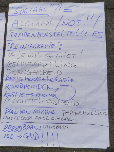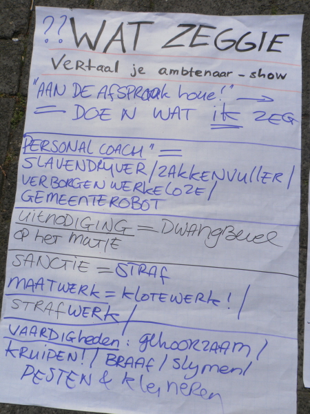 Daarna gingen we over tot de grote “Wat zeggie?” of “Vertaal je ambtenaar”-show, waarbij ook samen uit volle borst een lied gezongen werd. Hieronder lees je daarvan integrale tekst. We kregen veel leuke reacties van voorbijgangers en vooral van werklozen die bij Sociale Zaken moesten zijn. Sociale Zaken is immers de plek waar je doorgestuurd wordt naar het beruchte dwangarbeidcentrum. Ook enkele medewerkers van Sociale Zaken kwamen erbij staan, meestal geamuseerd, een enkeling hardop lachend. Een van hen beweerde dat we op de verkeerde plek stonden, omdat ambtenaren zoals zijzelf ook alleen maar hun werk moesten doen. Gelukkig denken sommige collega’s daar anders over, want die stribbelen wel degelijk tegen en spelen ons soms zelfs stiekem informatie toe.