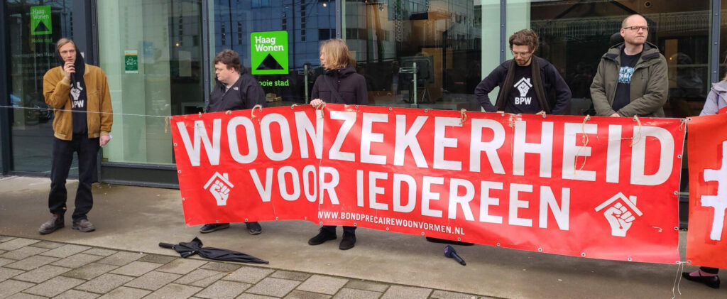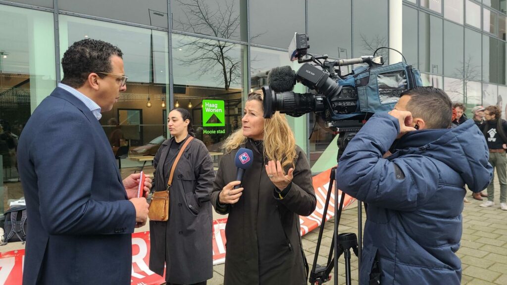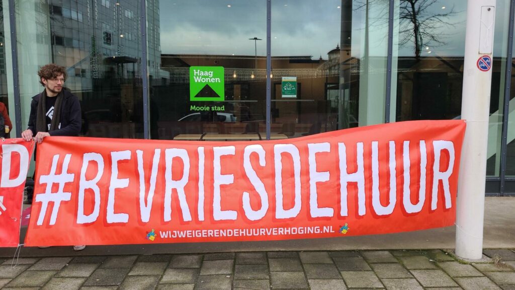 Zo’n veertig mensen deden vanmorgen mee met de actie “Bevries de huur”, georganiseerd door een coalitie van SP Den Haag, Bond Precaire Woonvormen Den Haag (BPW), Haagse Stadspartij en Wij weigeren de huurverhoging. Het protest vond plaats voor de ingang van het kantoor van woningcorporatie Haag Wonen aan de Waldorpstraat en was gericht tegen de hoogste huurverhoging in dertig jaar die Haagse woningcorporaties willen gaan invoeren.