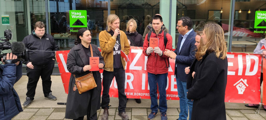 Het zwartboek werd tijdens de actie aangeboden aan een bestuurder van Haag Wonen. Zoals te doen gebruikelijk, sprak de hotemetoot links, maar doen hij en zijn collega-bestuurders rechts. Vanuit de demonstranten kwam de oproep aan woningcorporaties om zich activistischer op te stellen. Dus niet alleen zeggen dat je wilt opkomen voor de belangen van huurders, maar dat ook daadwerkelijk doen door je poot stijf te houden in de strijd tegen verwoestende neo-liberale marktwerking en de keiharde politiek van armen armer maken en rijken rijker.