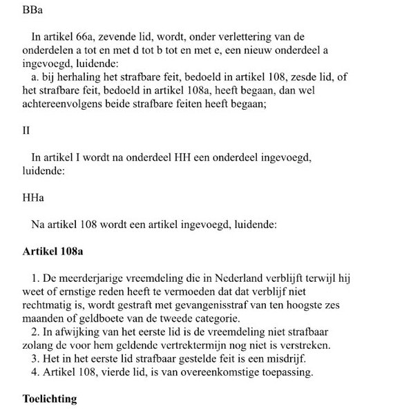 Het aangenomen amendement is tekstueel vrij eenvoudig: in de Vreemdelingenwet wordt een strafbaarheid opgenomen voor mensen die geen “geldige verblijfstitel” hebben. De straf is een gevangenisstraf van ten hoogste zes maanden of een geldboete van maximaal 5.150 euro.