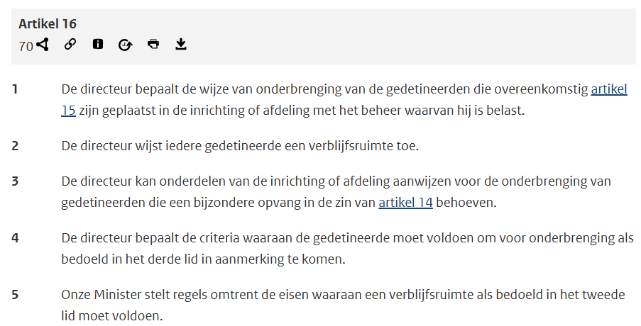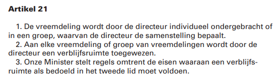 Als je art. 16 Pwb (over gevangenissen) en art. 21 Wtvb (vreemdelingenbewaring) vergelijkt, dan zie je dat de Wtvb voorsorteert op groepsgewijze detentie, met veel macht voor de minister om eenzijdig te bepalen wat het minimum is.