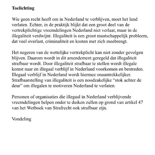“De Tweede Kamer heeft zojuist een amendement aangenomen om illegaliteit strafbaar te stellen. Ook het helpen onderduiken van een vreemdeling wordt dan strafbaar. Straf: maximaal 6 maanden cel (moet nog wel als wet door Tweede en Eerste Kamer)”, aldus NOS-journalist Arjan Noorlander op Twitter gistermiddag. Onze taal heeft geen woord sterk genoeg om mijn afschuw over dit amendement te vatten. De criminalisering van ongedocumenteerden is op zichzelf onacceptabel, en kan alleen maar leiden tot vervolging, geweld en de dood.