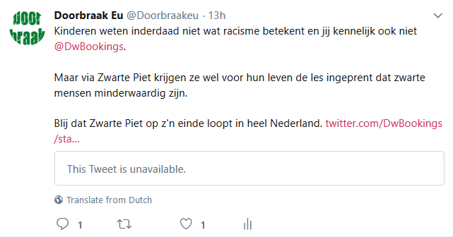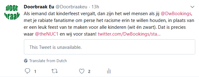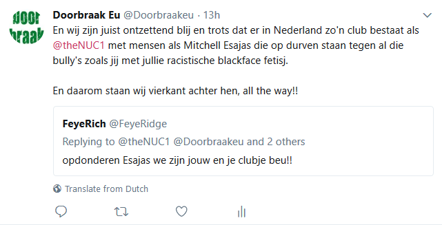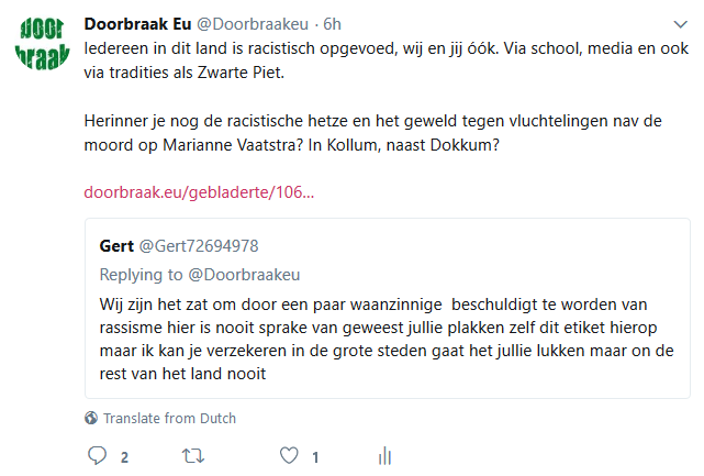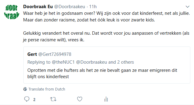 Leuk dat er de tweetreeks met een typisch racistisch-discriminirend tweet wordt afgerond.