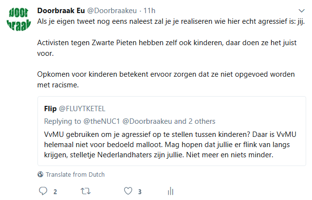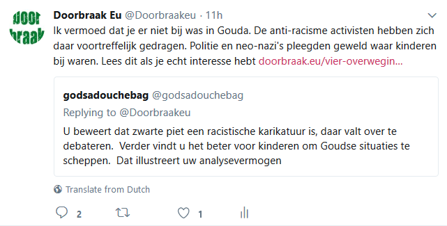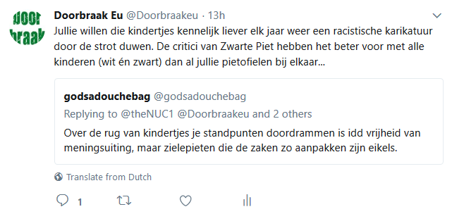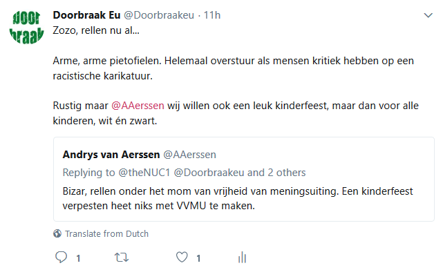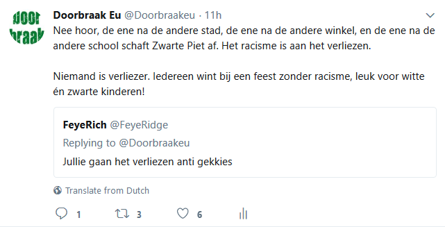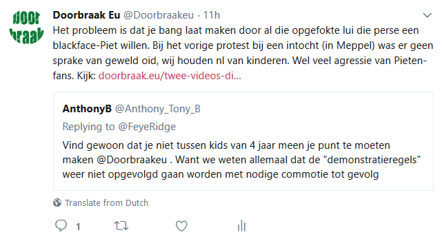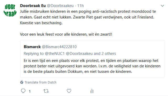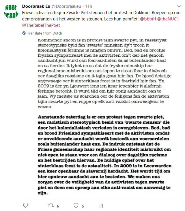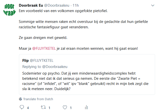 Gisteren stuurde een boze Friezin een opruiend filmpje de wereld in waarin ze opriep om de anti-racisten die morgen in Dokkum willen gaan protesteren tegen Zwarte Piet vooraf op de weg te gaan tegenhouden. Om olie op het racistische vuur te gooien interviewde Wierd Duk haar meteen voor De Telegraaf. Daarop keerde een deel van de woede van blackface-fans zich op Twitter tegen Doorbraak en vooral tegen Mitchell Esajas van New Urban Collective, die het Dokkumse protest mede organiseert. Later op de avond werd het tegenprotest van de pietofielen alweer verboden en verwijderde een aantal van de opgefokte pietofielen hun tweets snel weer. Hier een bloemlezing van onze reacties op hun (er steeds onder geplakte) woedende tweets.