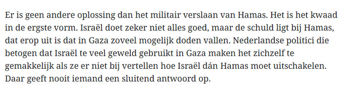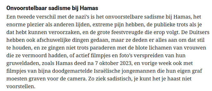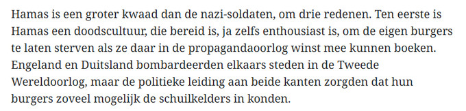 Bovendien zijn Hamas en de nazi’s op dit vlak nauwelijks te vergelijken. Hamas is een fundamentalistische terreurorganisatie die aanslagen pleegt en gijzelaars neemt. Nazi-Duitsland was een staat die meerdere genocides heeft gepleegd en een wereldoorlog voerde.