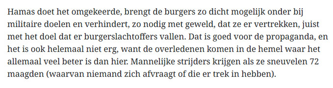 Dit soort ontmenselijking dient in het stuk van Plasterk om de genocide in Gaza goed te praten. Hij zegt dat hij het over Hamas heeft, maar door de islam erbij te halen zegt hij in feite dat het niet erg is als er moslims omkomen.