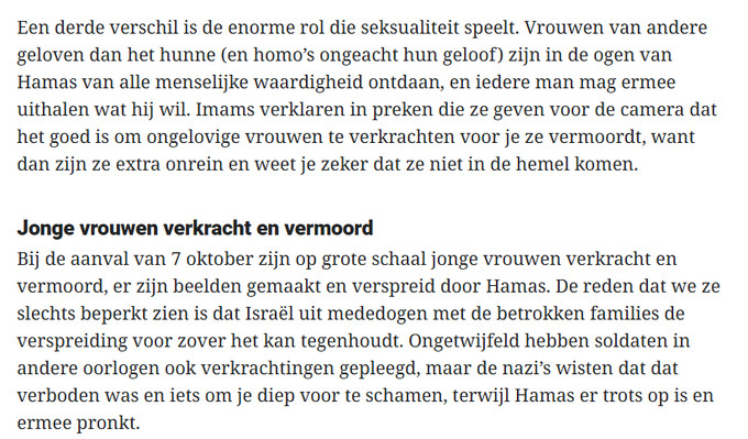 Het is belangrijk om zelf niet dit geweld te bagatelliseren. Ook dit seksueel geweld is geen grond voor de genocide die Israël nu aan het plegen is. Het is ook belangrijk om te erkennen dat dit hoogstwaarschijnlijk geen strategie was, maar geweld dat vaker voorkomt in oorlogen.