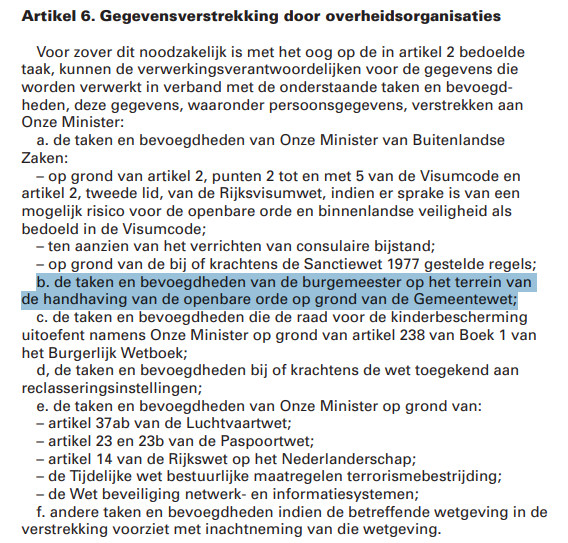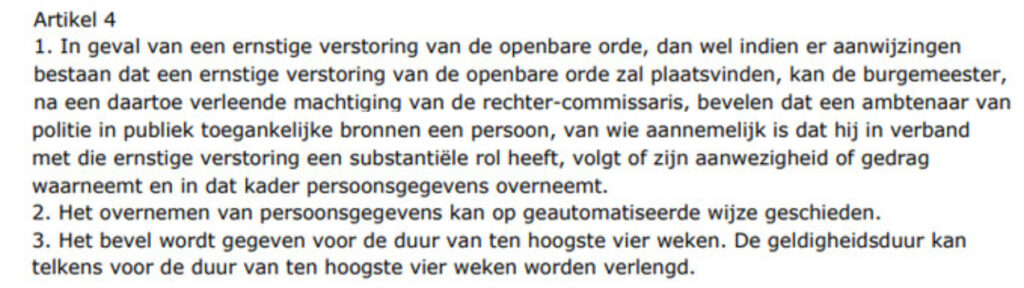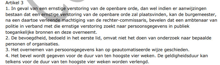 En nu dus ook hier. De nieuwe wet creëert nieuwe bevoegdheden voor de burgemeester en de politie om persoonsgegevens te verzamelen. Het gaat dan om het algemeen verzamelen van persoonsgegevens (artikel 3), en het zoeken naar specifieke personen (artikel 4).