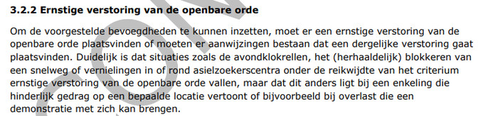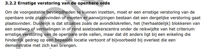 Maar het blijft niet bij snelwegblokkades. Volgens de Memorie is de term “ernstige verstoring” lastig af te bakenen, wat betekent dat die enorm breed geïnterpreteerd kan worden. Dat is dan ook het doel van de wet, om de politie een brede bevoegdheid te geven.