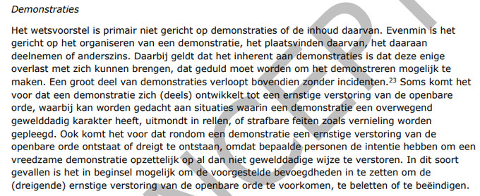 Daarnaast worden demonstraties ook genoemd. Die zijn in principe niet het doel van de wet, maar demonstraties kunnen wel leiden tot “ernstige verstoringen”. Daarmee zijn demonstraties dus wel een potentieel doel van deze wet.