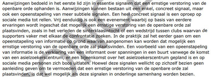 Wat de wet nog veel breder maakt, is dat alleen al “aanwijzingen” van een “ernstige verstoring” kunnen leiden tot de inzet van bevoegdheden. Die aanwijzingen hoeven niet concreet te zijn, waardoor enkele vage vermoedens (zoals mensen die zich “boos uitlaten” op sociale media) er ook al onder vallen.