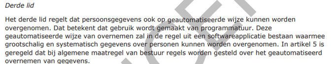 Dus onder deze wet kunnen heel veel gegevens worden verzameld, des te meer omdat de wet toestaat dat het overnemen van persoonsgegevens op “geautomatiseerde wijze” kan plaatsvinden. Dit mag dus met een algoritme of AI worden gedaan. Dit mag de regering eenzijdig bepalen.