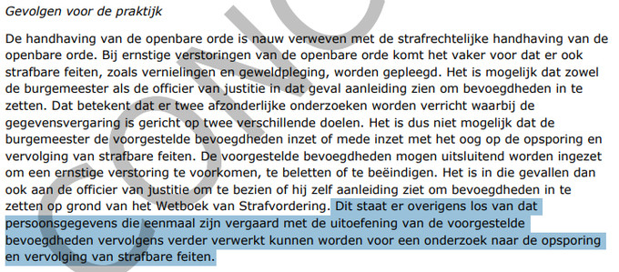 En daarin zit nog een groot risico, want de gegevens die de politie vergaart in het kader van deze wet mogen óók gebruikt worden in een strafzaak. Er bestaat dus een groot risico dat de politie deze bevoegdheden zal misbruiken om de eisen van het strafprocesrecht te omzeilen.