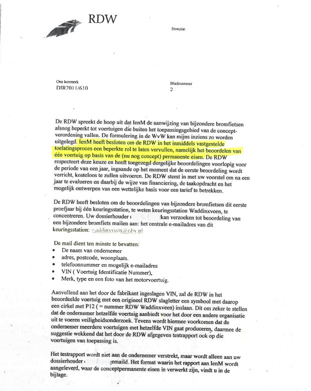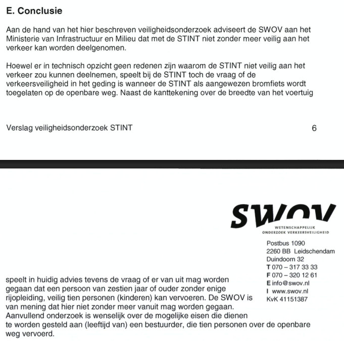 De nieuwe Wegenverkeerswet treedt op 1 januari 2011 in werking, en op 28 juli 2011 doet Stint een aanvraag om de stint aan te wijzen als een “bijzondere bromfiets”. Hierop doet de Rijksdienst Wegverkeer (RDW) en de Stichting Wetenschappelijk Onderzoek (SWOV) Verkeersveiligheid onderzoek.