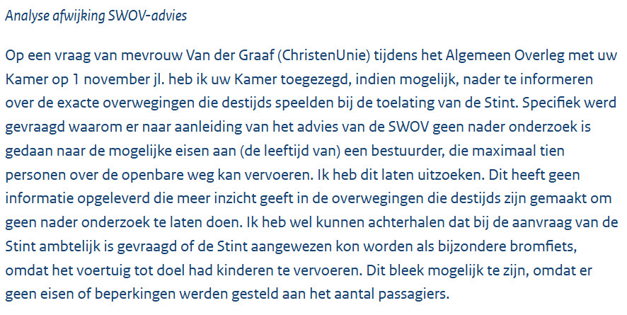 RDW en SWOV adviseren negatief. Allereerst is de stint te breed (110,5 cm tegen de toegestane 75 cm), waardoor de RDW hem afkeurt. De SWOV vind het daarnaast onwenselijk dat mensen vanaf zestien jaar oud zonder training tien kinderen kunnen vervoeren over de openbare weg, en adviseert tot nadere eisen.