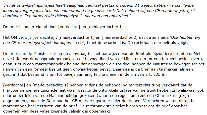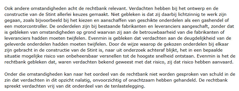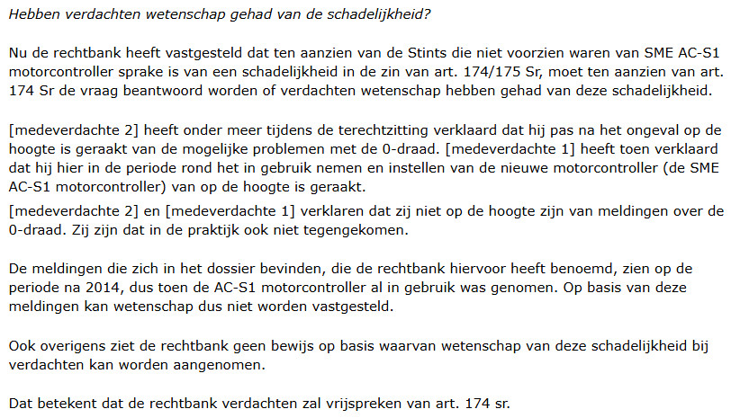 Waarom zijn de makers van de stint alsnog vrijgesproken? Bewezen is dat de gasveer van de stint in kwestie niet kapot was. Daarnaast kan niet bewezen worden dat de makers weet hadden van het 0-draad-probleem in hun stint. De rechter vind daarom dat niet bewezen dat er opzet was.