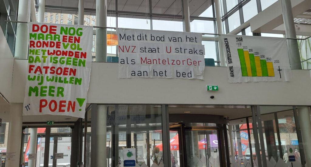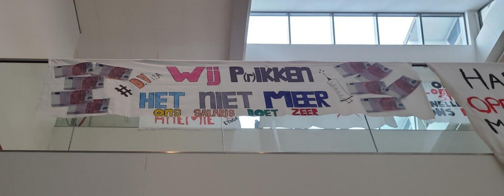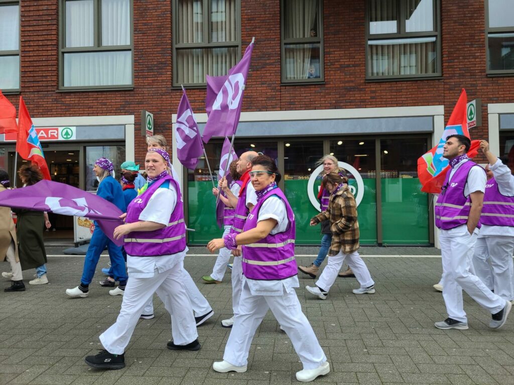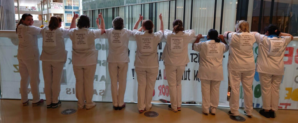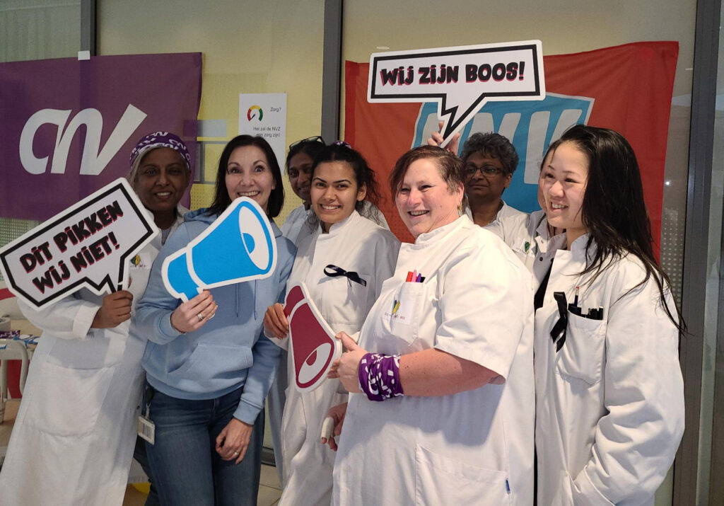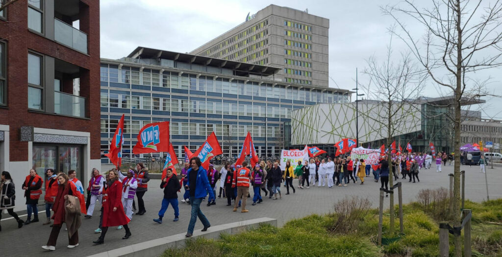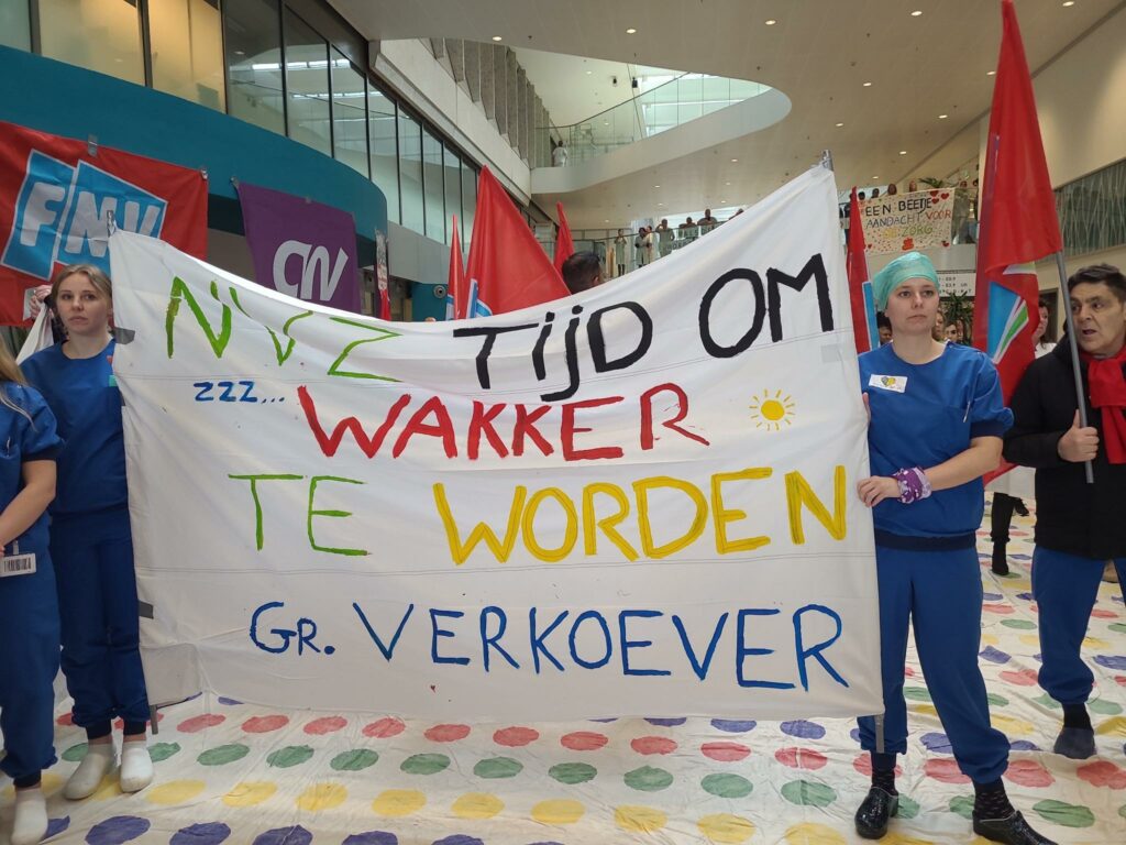 We zijn nu drie jaar verder. De onderhandelingen voor een nieuwe zorg-cao tonen aan dat de ziekenhuisbazen de zorgwerkers zo onfatsoenlijk mogelijk aan het afknijpen zijn. De bazen tellen de centen die hun medische winstfabrieken moeten opleveren, en proberen met man en macht om de loonkosten van hun personeel zo laag mogelijk te houden. De woede en actiebereidheid onder de zorgwerkers is groot, en dat leidde vandaag tot een stakingsdag onder regie van met name de vakbonden FNV en CNV. Inzet van de staking: het forceren van een doorbraak in de cao-onderhandelingen. En als dat niet mocht lukken, dan zouden er nieuwe acties gaan komen.