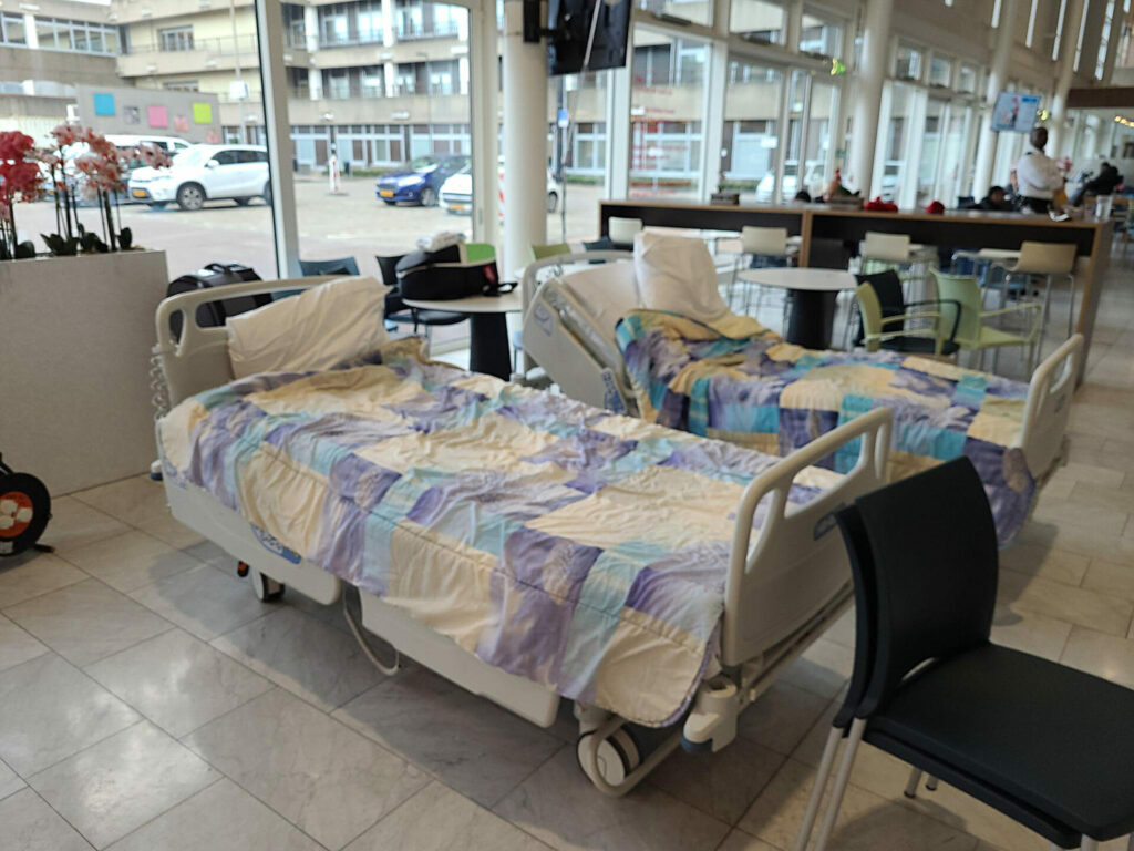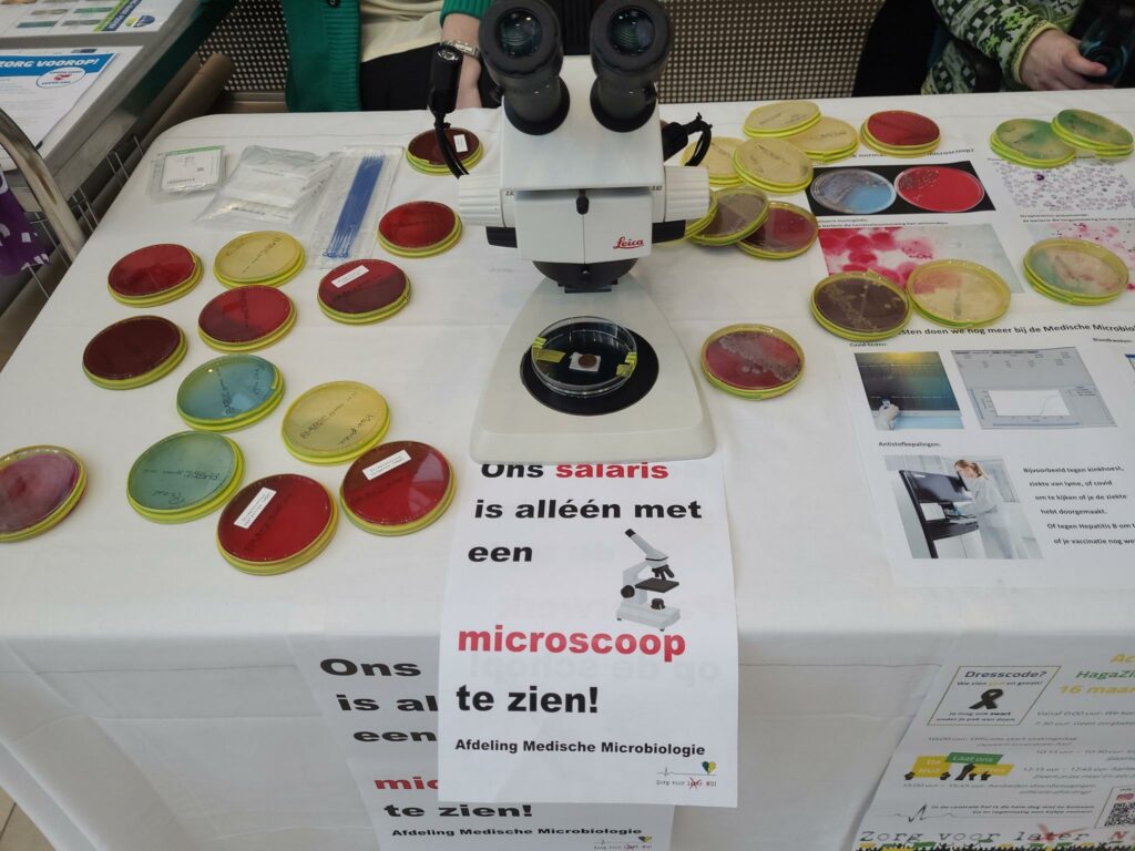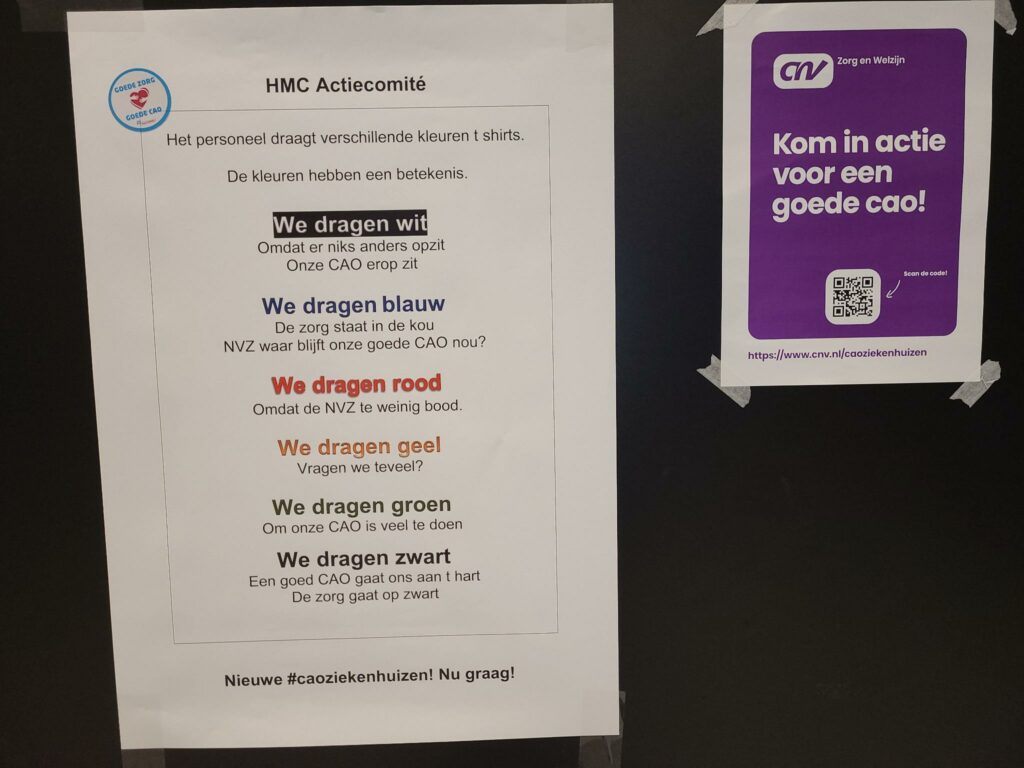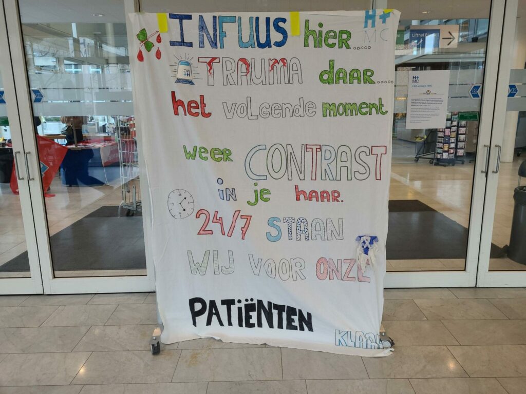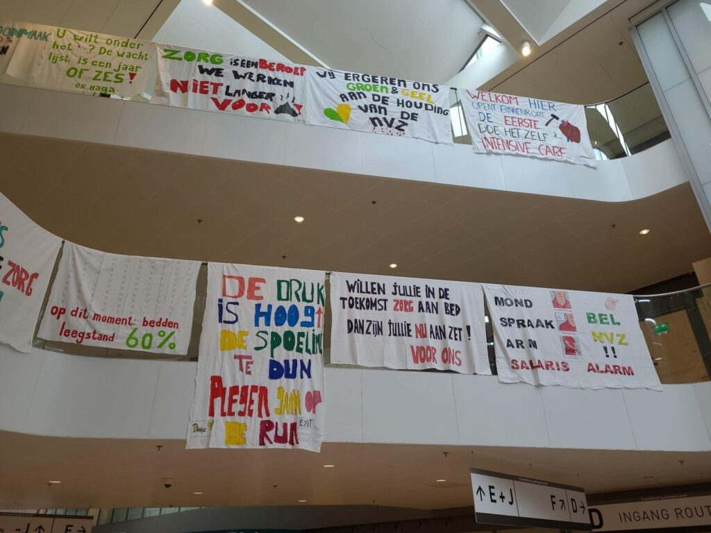 De stakingsdag in het Haga-ziekenhuis begon vanmorgen om 10:00 uur, met een opening op een podium in de centrale hal van het ziekenhuis. Daar verzamelden zich in de loop van de dag honderden stakers, voor een deel als lid van de FNV of de CNV. In de weken die vooraf gingen aan deze dag was de strijdbaarheid van het Haga-personeel al volkomen duidelijk geworden, toen er steeds meer spandoeken, posters en flyers in de centrale hal en op de afdelingen van het ziekenhuis te zien waren. Met dat actiemateriaal werd niet alleen forse kritiek geleverd op hun bazen van de NVZ, maar ook op het kabinet-Rutte en op de Tweede Kamer. “Van hero naar zero”, aldus een van de vele spandoeken die het anders zo saaie ziekenhuis een stuk levendiger maakten. Daarmee gaven de zorgwerkers te kennen dat hun voormalige heldenstatus van drie jaar geleden inmiddels tot het nulpunt was gedaald. Ook de zorgwerkers in het HMC-ziekenhuis hingen de afgelopen weken flink wat spandoeken en actieposters op.
