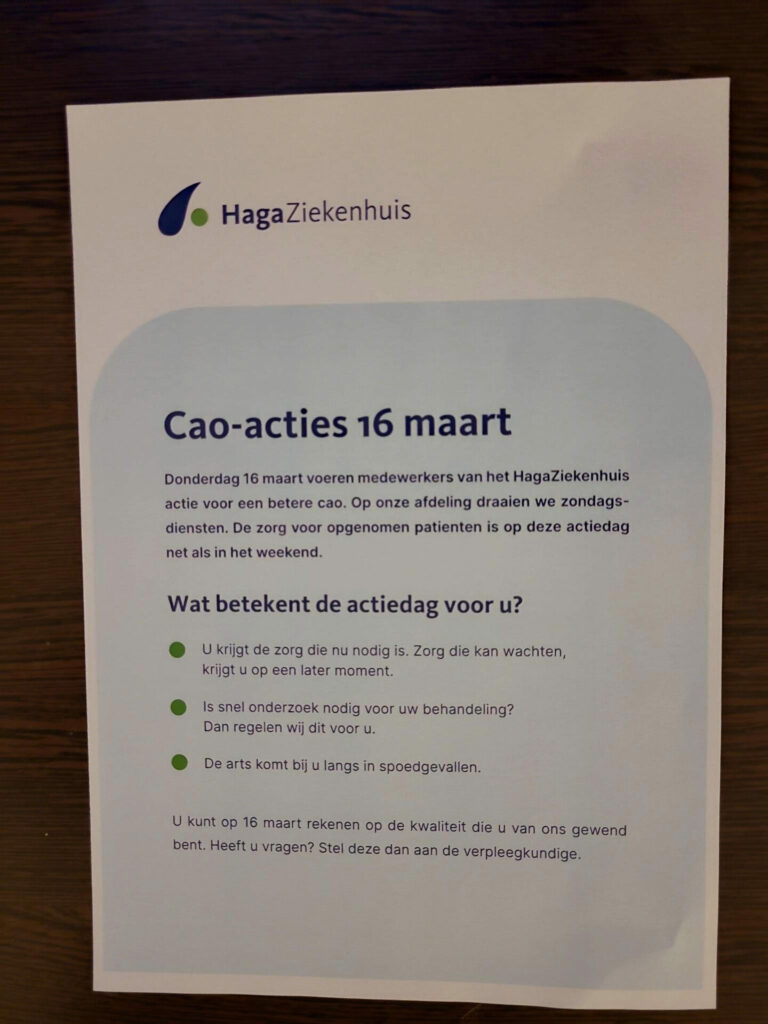 Het hoogtepunt van de stakingsdag in het Haga-ziekenhuis bestond uit een “herrieprotest” buiten bij het ziekenhuis. Voorzien van spandoeken en van potten en pannen om geluid mee te maken, maakte een fors aantal zorgwerkers een actierondje om het ziekenhuis heen. Daarbij bezochten ze ook de parkeergarage waar zorgwerkers hun auto kunnen parkeren. Een van hun grieven is dat ze voor dat parkeren uit eigen zak moeten betalen, waardoor ze dus minder geld verdienen. De stemming zat er tijdens de actie goed in. Nadat de stakers waren teruggekeerd in de hal van het ziekenhuis, hielden een paar mensen vanuit de vakbond nog wat praatjes. Daarna volgde nog entertainment. In het HMC Westeinde-ziekenhuis werd ook gestaakt. Daar stonden in de centrale hal van het ziekenhuis demonstratief drie ziekenhuisbedden opgesteld, begeleid door actieteksten.