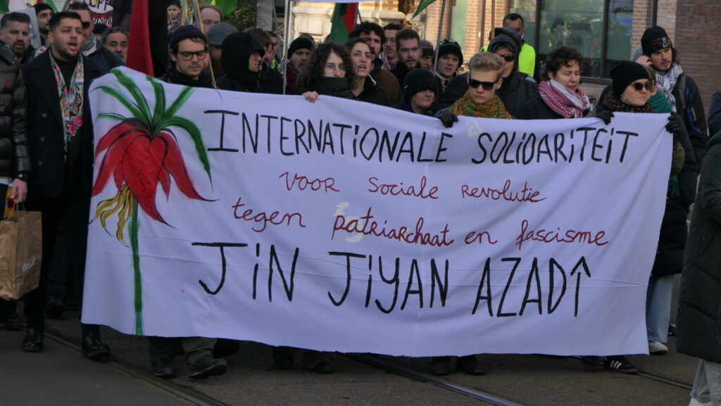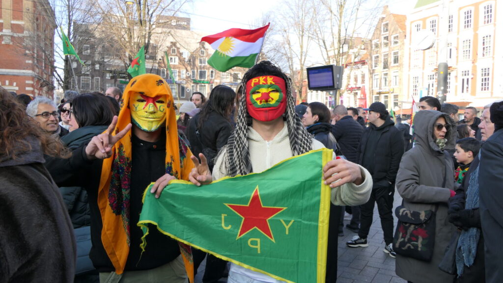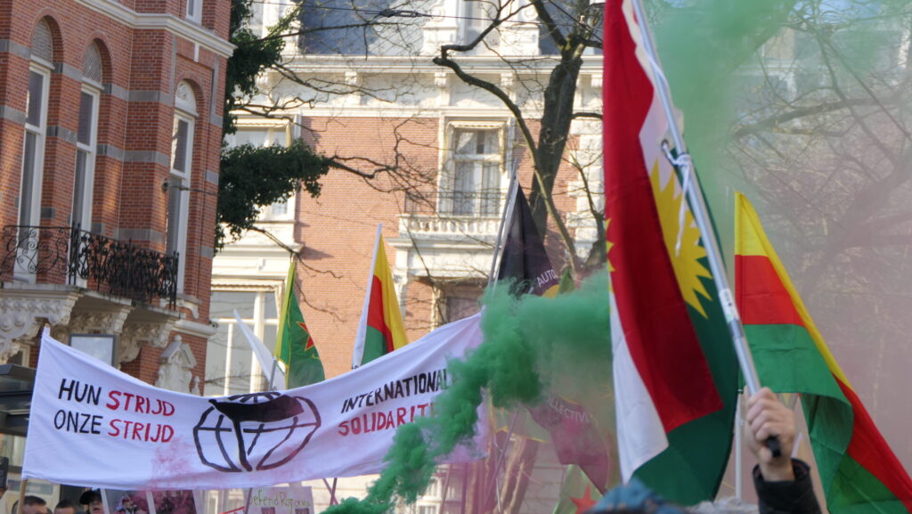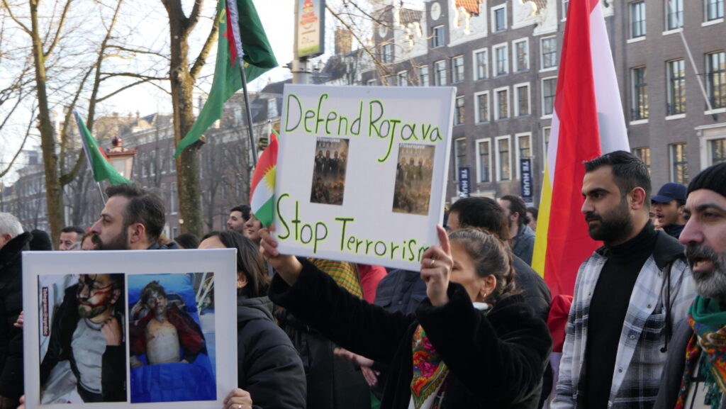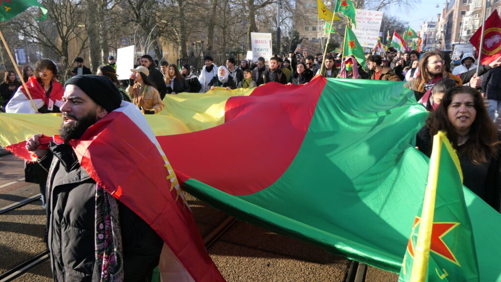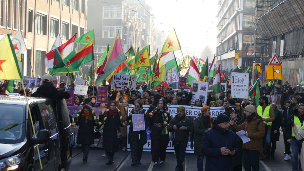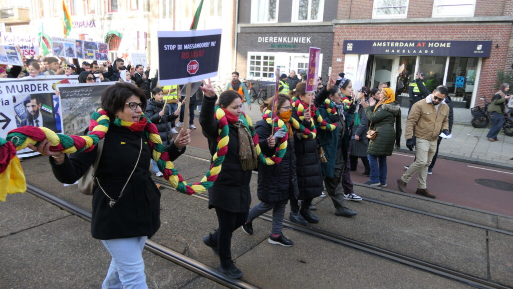 Vandaag deden een paar duizend mensen mee in Amsterdam aan de uiterst strijdbare demonstratie voor een vrij Rojava, het gebied in Noordoost-Syrië dat momenteel aangevallen wordt door de fundamentalistische milities van de Hiyat Tahrir-es Sham (HTS) en aanverwante jihadistische groeperingen. Die worden daarbij gesteund door de Turkse regering.