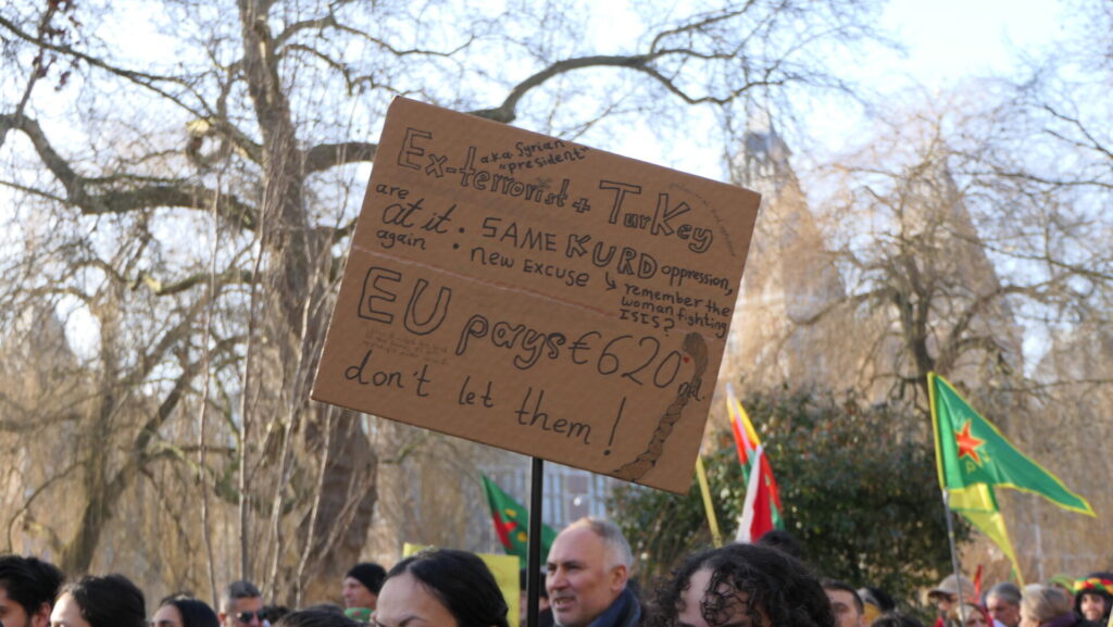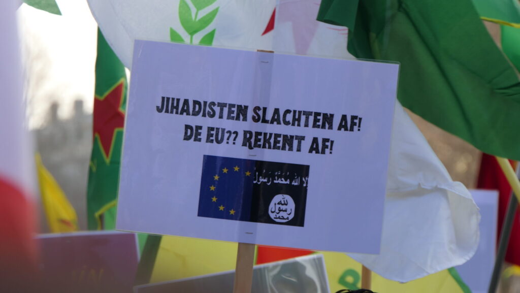 Ze hebben al duizenden ISIS-terroristen bevrijd – dezelfde ISIS die de Koerdische bevolking heeft verslagen en gevangen gezet! Nu laten ze die monsters weer los om het vrije, democratische en gendergelijke systeem van Rojava te vernietigen. Ze moorden, ze verkrachten, ze plunderen, ze branden – allemaal met EU-financiering van ons belastinggeld uit het Westen.