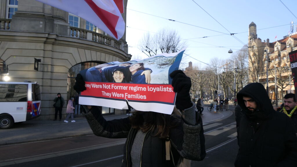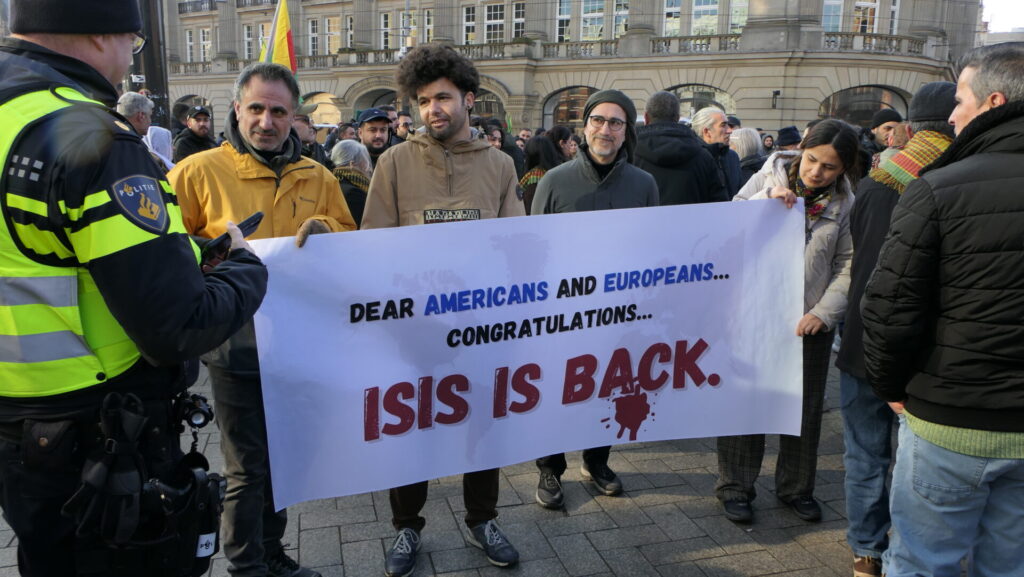 - Wij demonstreren zodat de Nederlandse regering en het Europees Parlement de legitimiteit van de extremistische regering van Damascus onmiddellijk intrekken.