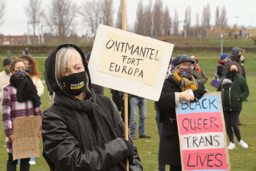 ![Een persoon in het zwart, met een mondkapje met de tekst "Bedek je mond, niet je mening" en een bord met de tekst "Ontmantel Fort Europa". Op de achtergrond een persoon met een kleurige pet en een bord in de kleuren van de transvlag met de tekt "Black queer lives"[matter]".](https://www.doorbraak.eu/blog/wp-content/uploads/IMG_7682-1024x683.jpg)
