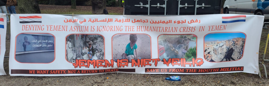 De vele spandoeken en actieborden die tijdens de protestactie waren te zien, gaven een helder beeld van de moeilijke situatie waar Jemenitische vluchtelingen in Nederland zich in bevinden. “Jemenitische vluchtelingen lijden in de kampen onder zware omstandigheden en enorme psychische druk door jarenlange wachttijden, willekeurige afwijzingen en oneerlijke beoordelingen van onze asielaanvragen. Wij eisen een eerlijke en snelle beoordeling van de asielaanvragen van Jemenieten, in overeenstemming met de humanitaire en veiligheidsrealiteit in Jemen, en benadrukken ons recht in een land dat menselijke waarden respecteert”, zo viel te lezen op een van de spandoeken. De energieke en enerverende actie was goed voorbereid en werd uitstekend begeleid door de organisatoren. “Wij behoren tot de vergeten mensen”, aldus een van de actieborden. “Ze hebben onze kinderen vermoord” en “Ze hebben ons uitgehongerd”, aldus ander actiemateriaal, dat in tekst en met foto’s uiting gaf aan de verschrikkingen in Jemen.
