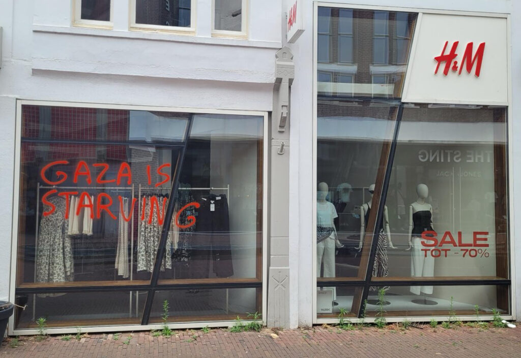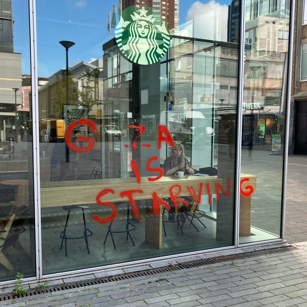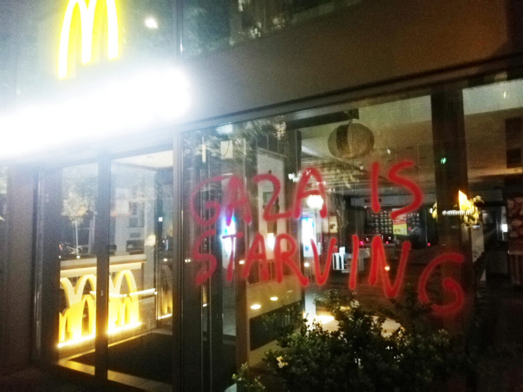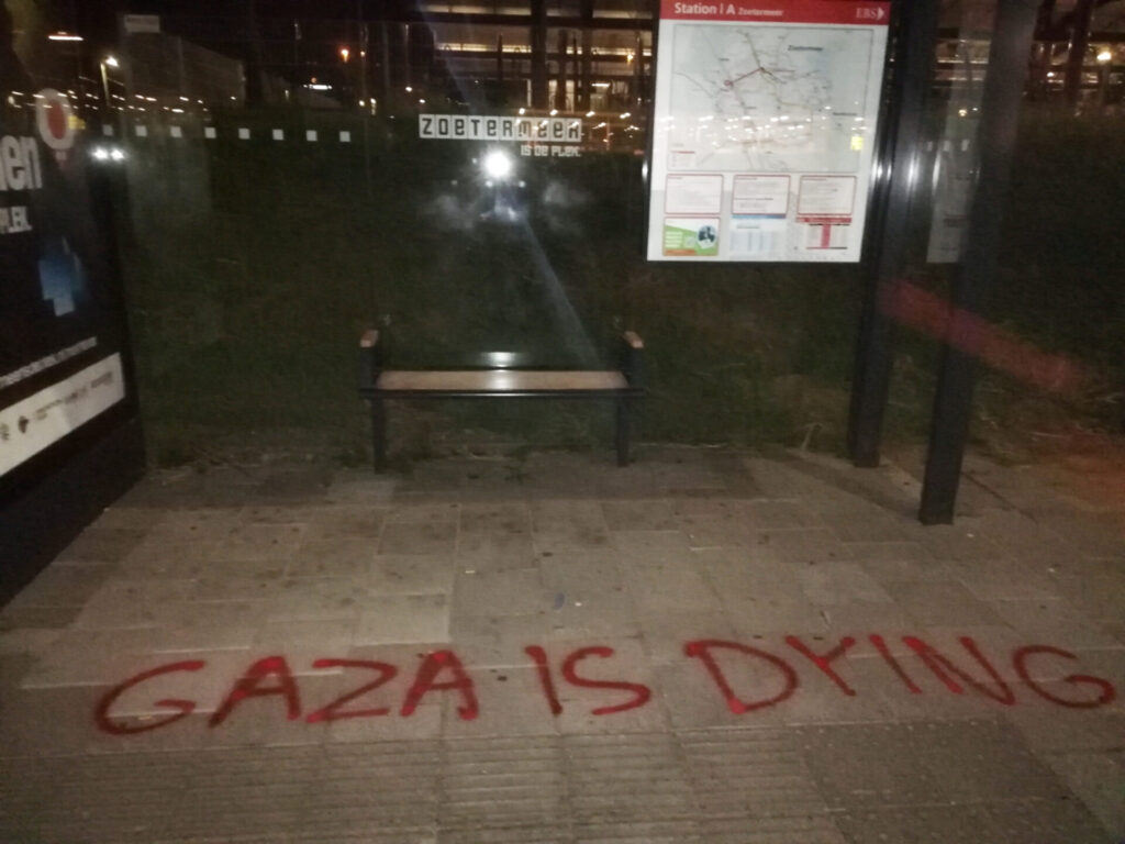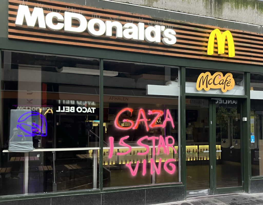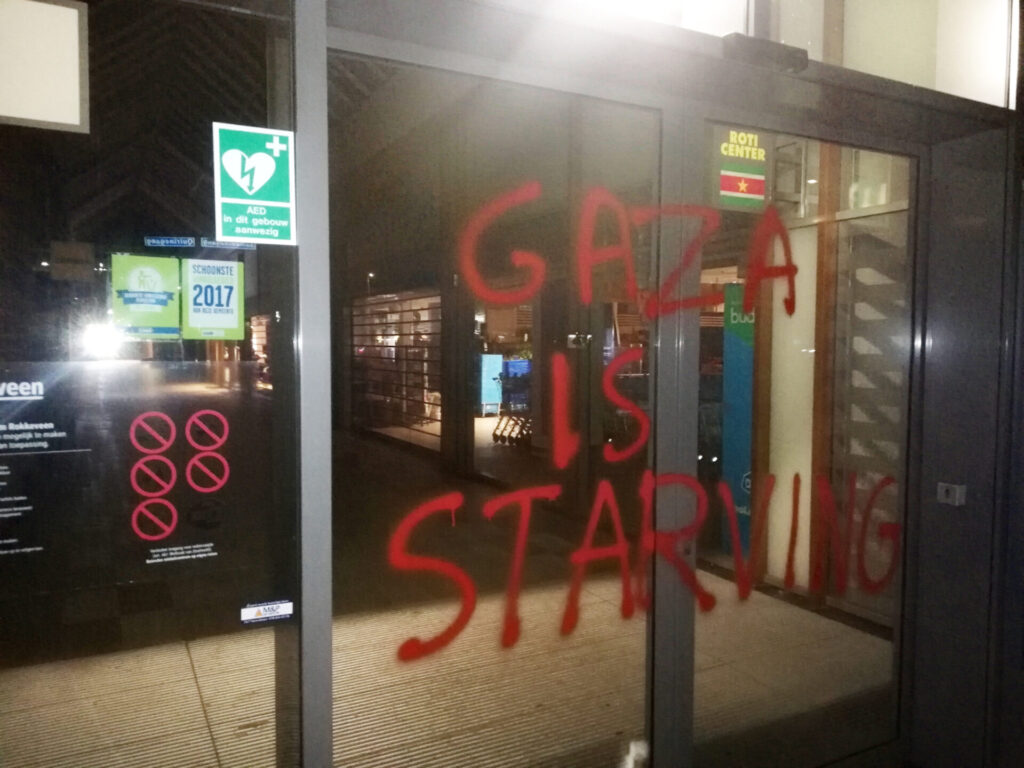 “Afgelopen nacht hebben activisten van Justice Now!, een actiegroep van Extinction Rebellion, restaurants en winkels in Rotterdam, Zoetermeer en Gouda beklad met de leus ‘Gaza is starving’”, aldus een persbericht dat naar Doorbraak werd gestuurd. “Eerder deze week zijn er in andere steden vergelijkbare acties geweest.” Gisteren vonden er daarnaast in veel steden en stations ook nog eens sit in-acties plaats tegen het uithongeren van de bevolking van Gaza door Israël. Die sit-in acties kenden een grote opkomst, mede dankzij het Rode Lijn-effect van twee demonstraties van meer dan 100.000 mensen in Den Haag op 18 mei en 15 juni. Niet alleen verbreedt het protest zich tegen de genocide in Gaza via steeds grotere demonstraties op steeds meer plekken. Ook gaan er meer activisten over tot radicalere vormen van verzet.