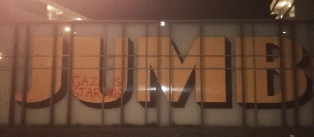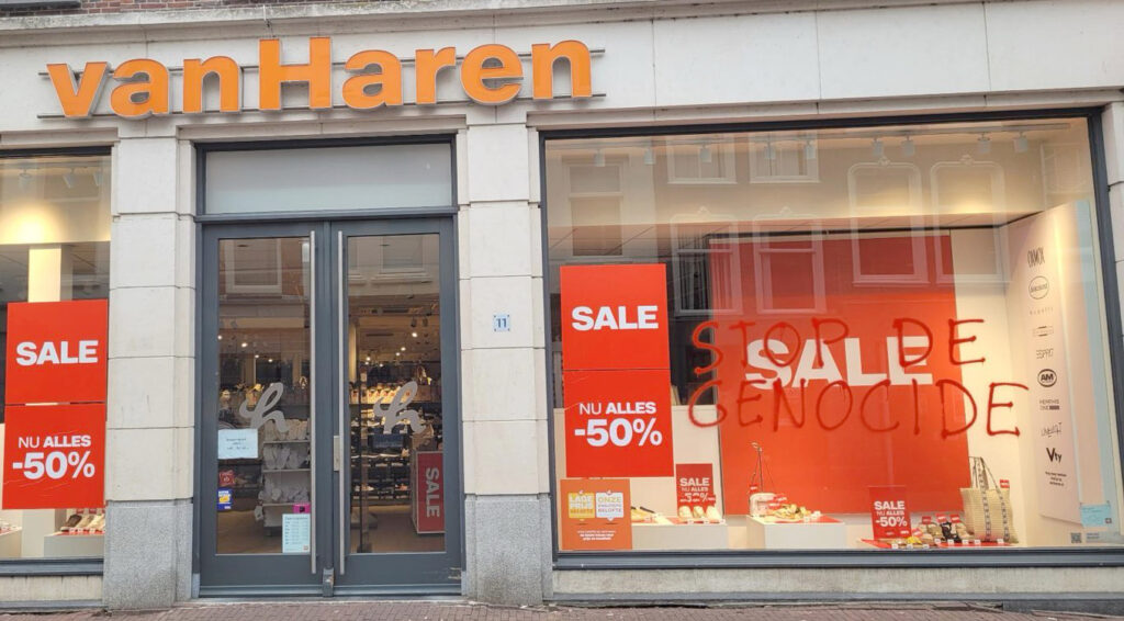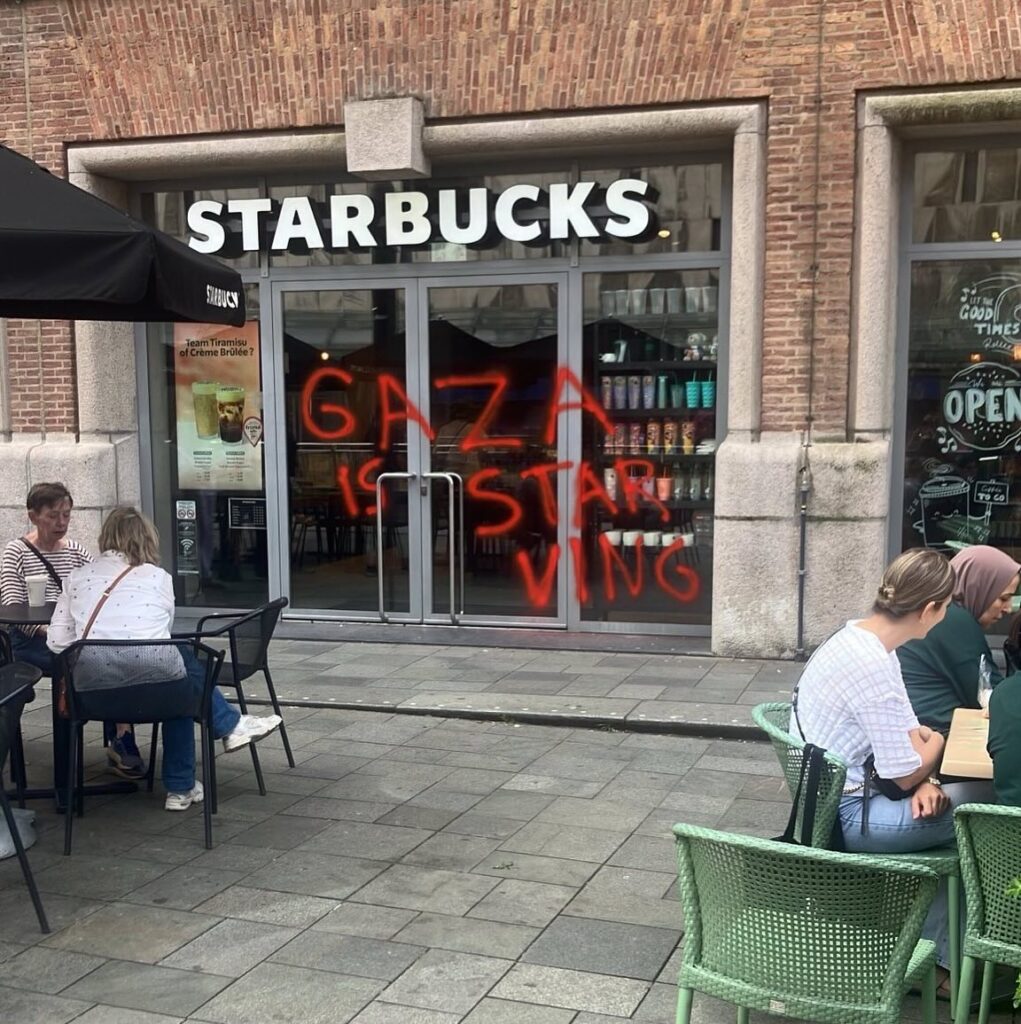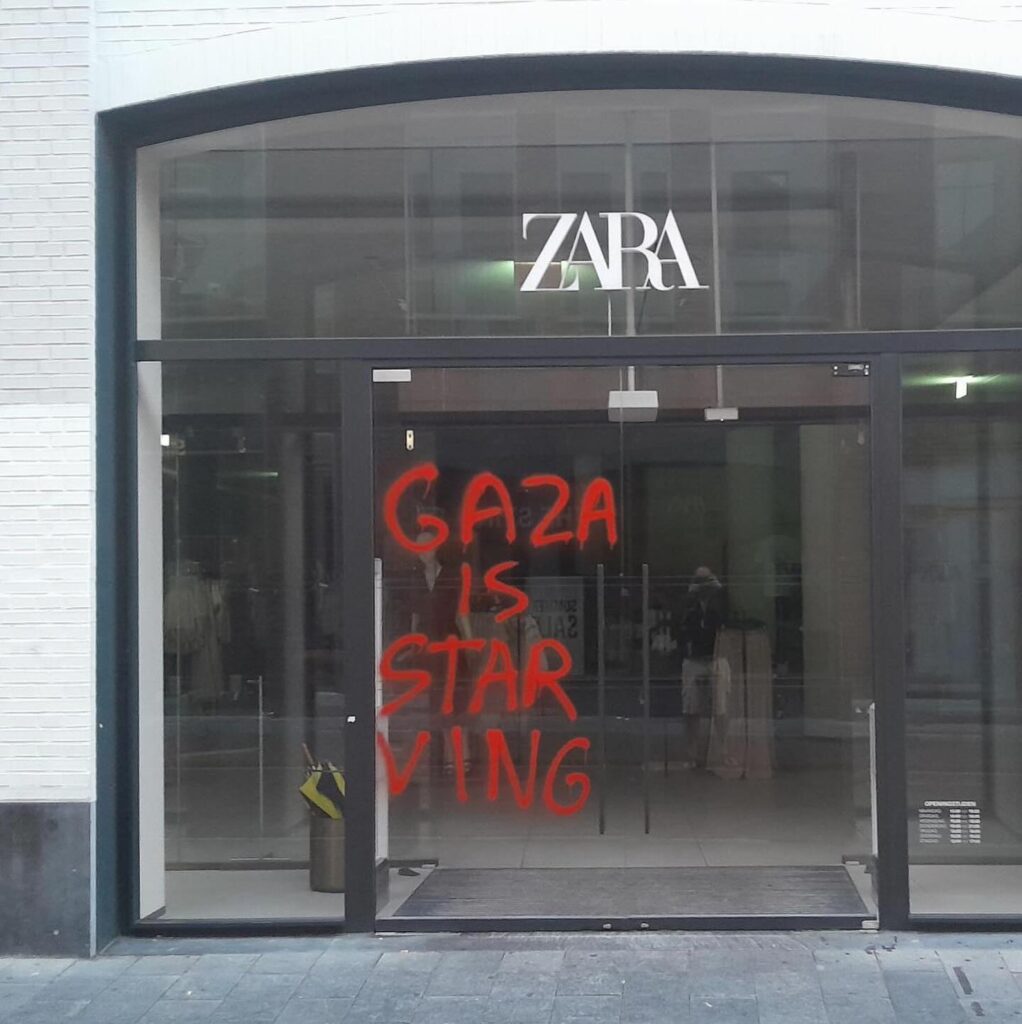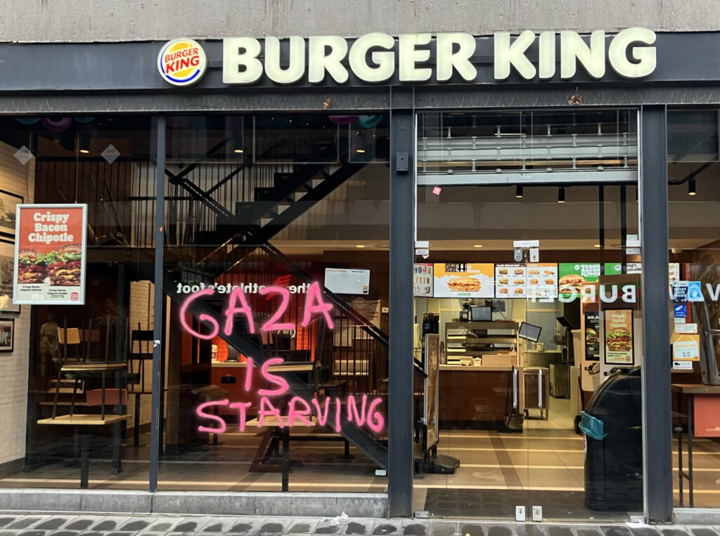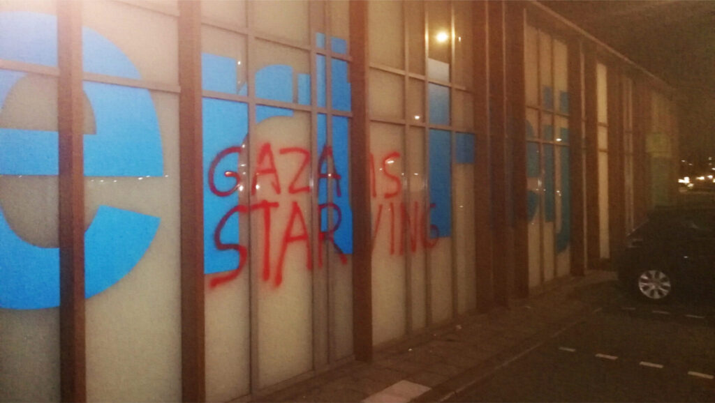 “Afgelopen nacht hebben activisten van Justice Now!, een actiegroep van Extinction Rebellion, restaurants en winkels in Rotterdam, Zoetermeer en Gouda beklad met de leus ‘Gaza is starving’”, aldus een persbericht dat naar Doorbraak werd gestuurd. “Eerder deze week zijn er in andere steden vergelijkbare acties geweest.” Gisteren vonden er daarnaast in veel steden en stations ook nog eens sit in-acties plaats tegen het uithongeren van de bevolking van Gaza door Israël. Die sit-in acties kenden een grote opkomst, mede dankzij het Rode Lijn-effect van twee demonstraties van meer dan 100.000 mensen in Den Haag op 18 mei en 15 juni. Niet alleen verbreedt het protest zich tegen de genocide in Gaza via steeds grotere demonstraties op steeds meer plekken. Ook gaan er meer activisten over tot radicalere vormen van verzet.