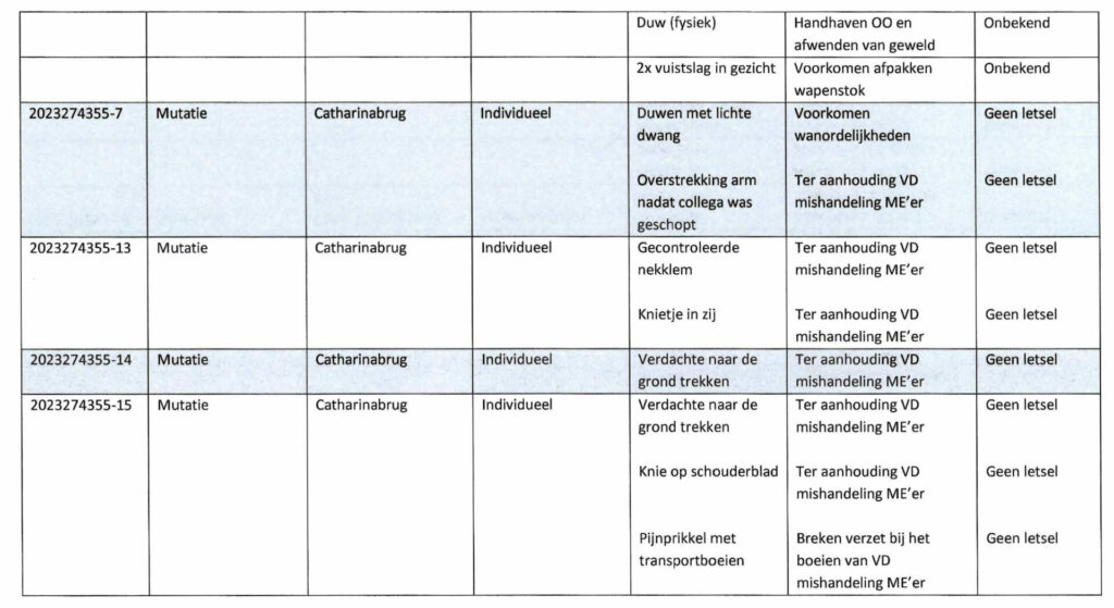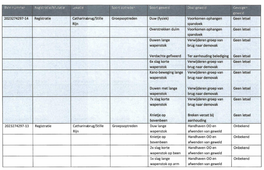 Het valt overigens op, in de onderstaande geweldsregistratie, dat de politie meerdere keren zeer algemene redenen geeft voor het gebruik van geweld. Redenen die bijkans in elke situatie kunnen worden gesteld, en zonder kans op weerwoord altijd “reden” geven voor agenten om erop los te slaan. We doelen dan bijvoorbeeld op “voorkomen wanordelijkheden” of het een aantal keer voorkomende “handhaven oo” (openbare orde, red). Op deze manier kan de politie altijd hun straatje schoonvegen, aangezien “niet doen wat de politie zegt” voor hen een wanordelijkheid is. De politie hoeft zo niet in te gaan op onze stelling dat de wanordelijkheden juist kwamen door het politieoptreden, en demonstranten én omstanders in gevaar werden gebracht door sla-grage ME-ers.