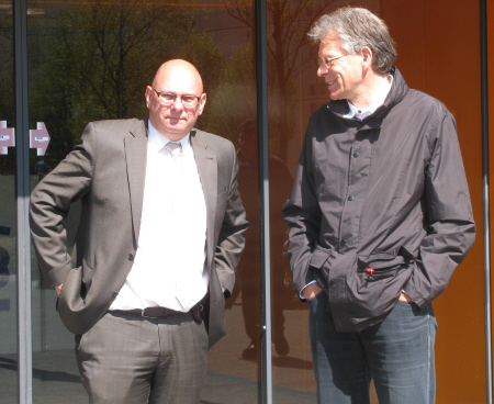 Links onderdirecteur Rob van Rijn, mogelijk later achter tralies wegens georganiseerde mensenhandel.Bij aanvang van de viering kwam onderdirecteur Rob van Rijn even poolshoogte nemen op het plein. Hij wilde weten of er “geen gekke dingen” zouden gaan gebeuren. Ook vond hij dat we geen foto’s van hoofden van zijn bewakers op de werkvloer mochten gebruiken als doelwit bij het inmiddels traditionele ballenwerp-spel. “Dat zijn gewoon ambtenaren die democratisch genomen beslissingen uitvoeren”, meende hij. “Ze mogen blij zijn dat het bij een zacht balletje tegen hun foto blijft”, zo werd hem te kennen gegeven. “Dat valt in het niet bij de vernederingen die ze de dwangarbeiders dag in dag uit aandoen.” Van Rijn hield zich in: “Ik heb geen mening, ik ben een ambtenaar.” Waarop hij tot antwoord kreeg: “Het is niet onmogelijk dat de bewakers ooit, samen met jou, achter tralies verdwijnen wegens het onwettig aanzetten van mensen tot dwangarbeid. Wat jullie hier doen, is feitelijk georganiseerde mensenhandel.”