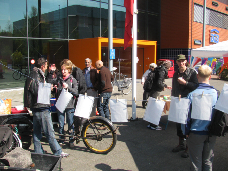 Geen dwangarbeid, maar bestaanszekerheid.Vandaag hebben in Leiden ongeveer 25 mensen de Dag van de Arbeid gevierd op het plein voor het dwangarbeidcentrum DZB. Net als vorig jaar was er weer muziek, een hapje en een drankje, en werd er een aantal korte praatjes gehouden. Van de dwangarbeiders waren er slechts zeven aanwezig. De directie had hen vanochtend om tien uur plotseling allemaal naar huis gestuurd. Een kleine overwinning!