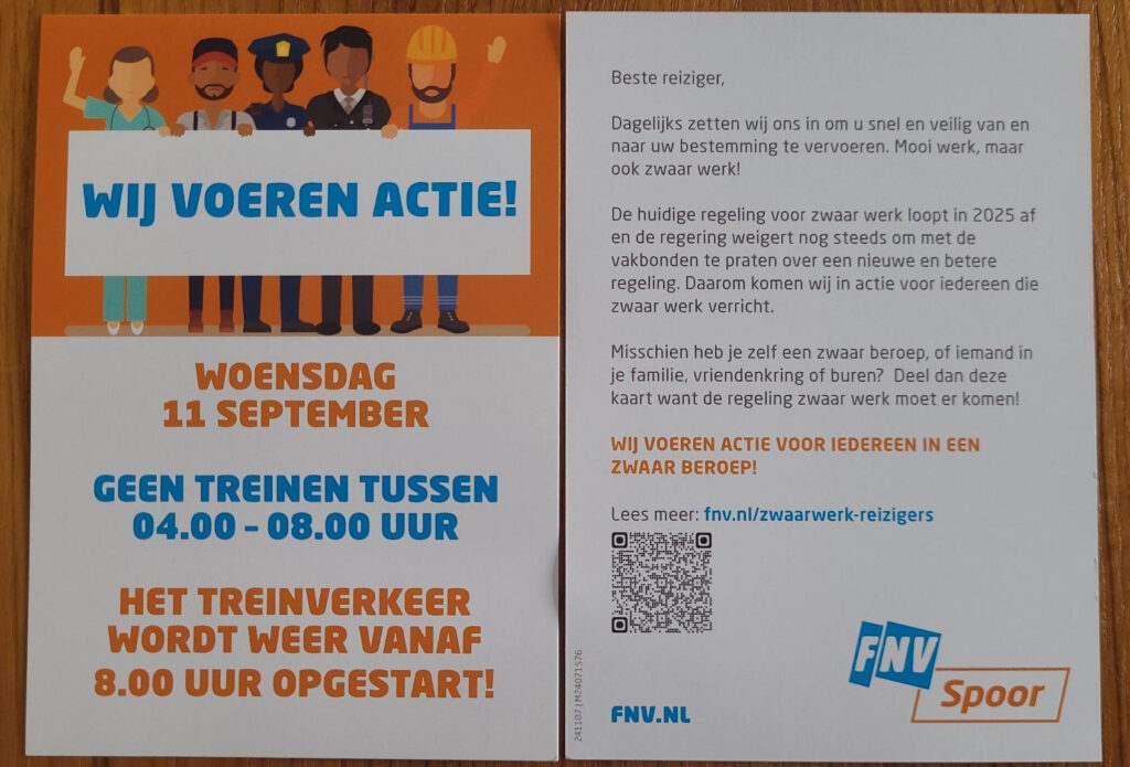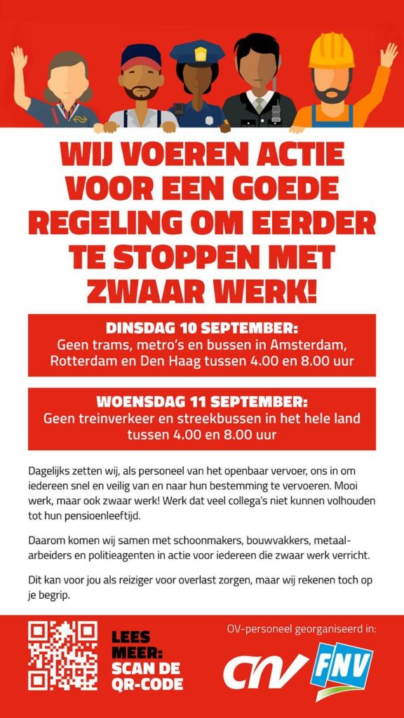 Er is door anderen hier al het een en ander verteld over deze campagne. Ik ga nu wat vertellen over komende stakingsacties in het OV. Die acties gaan plaatsvinden op 10 en 11 september. Dan gaan OV-werkers staken bij het landelijke treinvervoer, het stadsvervoer en het streekvervoer. Die stakingen zijn gericht tegen de dreigende afschaffing van de zogeheten Regeling Vervroegd Uittreden (RVU). Dat is een regeling voor mensen die zwaar werk verrichten, niet alleen bij de treinen, trams en bussen, maar ook in andere sectoren. De regeling houdt in dat mensen eerder kunnen stoppen met dat werk, maximaal drie jaar voor hun pensioen. Maar die regeling dreigt per 1 januari 2025 te verdwijnen, waardoor duizenden mensen ineens langer moeten doorgaan met zwaar werk. Dat is asociaal en onrechtvaardig.
